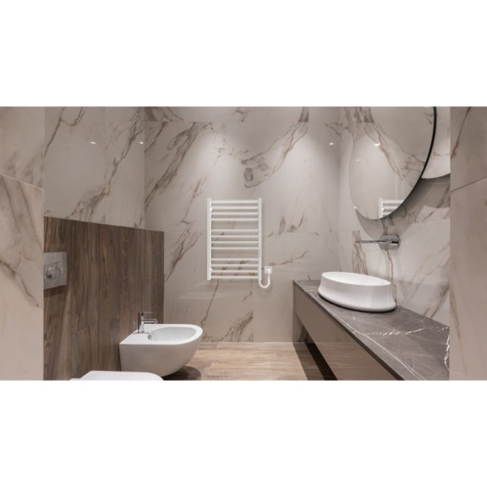 Працює за технологією сухого ТЕНу. Обладнана вбудованим таймер-регулятором і конектором для підключення до живлення з будь-якого боку. Оснащена комплектом для прихованого підключення. Модель має 12 ребр з квадратної труби та стійки з квадратної труби. Матеріал - чорна сталь з антикорозійною обробкою(фосфотація). Варіанти покриття: чорний мат або білий мат.
