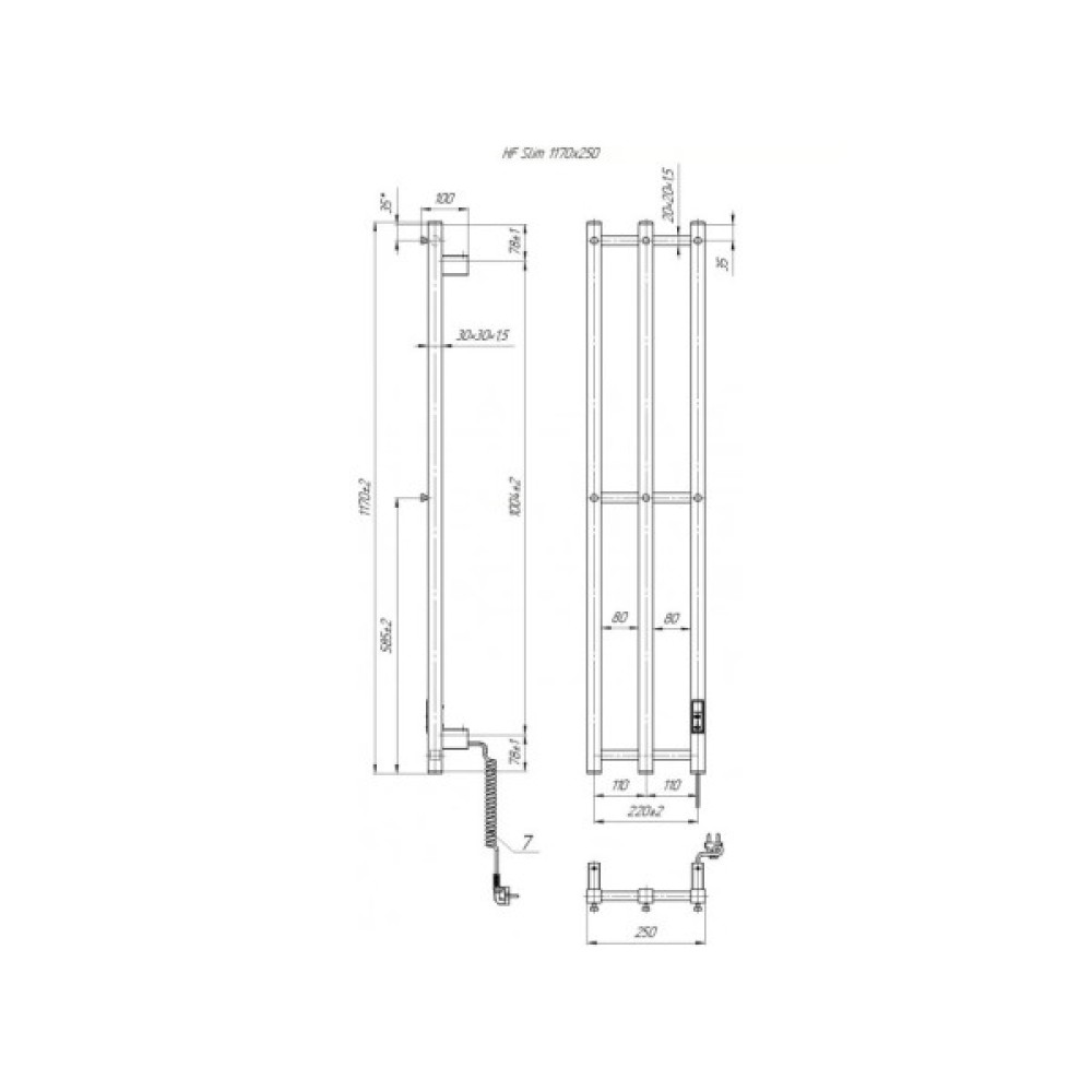 Електрична рушникосушарка HF Slim 1170х250. Працює за технологією сухого ТЕНу. Обладнана вбудованим таймер-регулятором і конектором для підключення до живлення з будь-якого боку. Оснащена комплектом для прихованого підключення. Модель має 3 ребера з круглої труби та стійки з квадратного профілю. Матеріал – чорна сталь з антикорозійною обробкою. Варіанти покриття: чорний мат або білий мат. Температурні режими таймер-регулятора: 40°С, 45°С, 50°С. Час роботи: 3, 6 годин або постійний нагрів. Потужність 110 Вт. Гарантія – 3 роки.