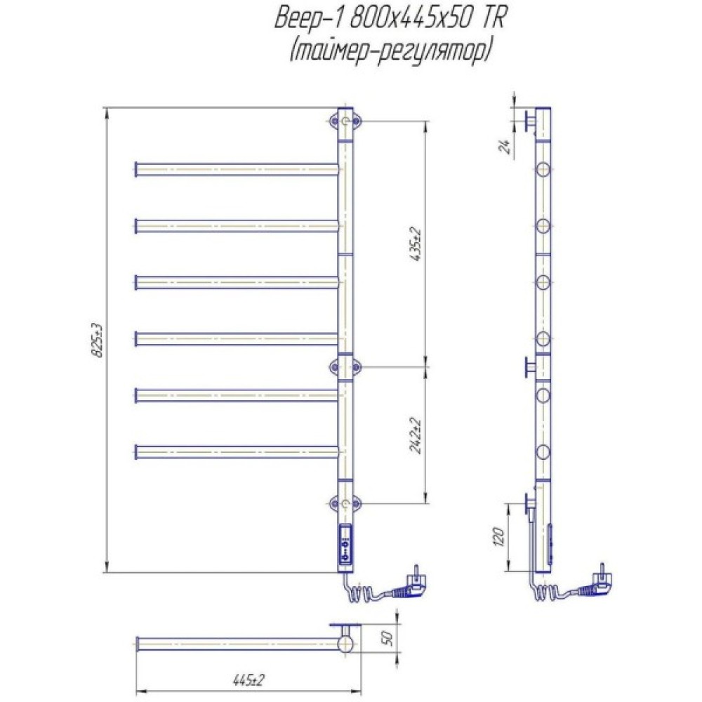 Електросушарка для рушників побутова Веєр-I 800х445/55 TR. Обладнана таймер-регулятором. Можлива варіація з комплектом прихованого підключення. Має 6 ребер які повертаються на 180° та стояк з круглої труби. Виготовлена з полірованої нержавіючої сталі без хромування. Варіанти покриття: полірована. Температурні режими таймер-регулятора: 40°С, 45°С, 50°С. Варіанти часу роботи: 3, 6 годин та постійний нагрів. Потужність 80 Вт. Додатково для зручності користування можна оснастити навісними гачками. Гарантія - 5 років.