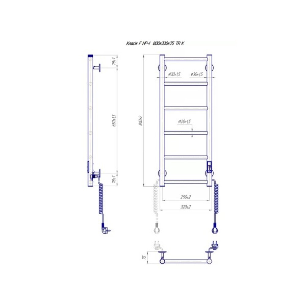 Електросушарка для рушників побутова Класик F НР-I 800х330/75. Обладнана таймером-регулятором і конектором для підключення в розетку з будь-якого боку. Сумісна з комплектом прихованого підключення. Має 6 ребер і стояк із круглої труби. Виготовлений з полірованої нержавіючої сталі без хромування. Температурні режими таймер-регулятора: 40°С, 45°С, 50°С. Варіанти часу: 3, 6 годин і постійний нагрів. Потужність 65 Вт. Додатково для зручності використання можна оснастити навісними гачками.