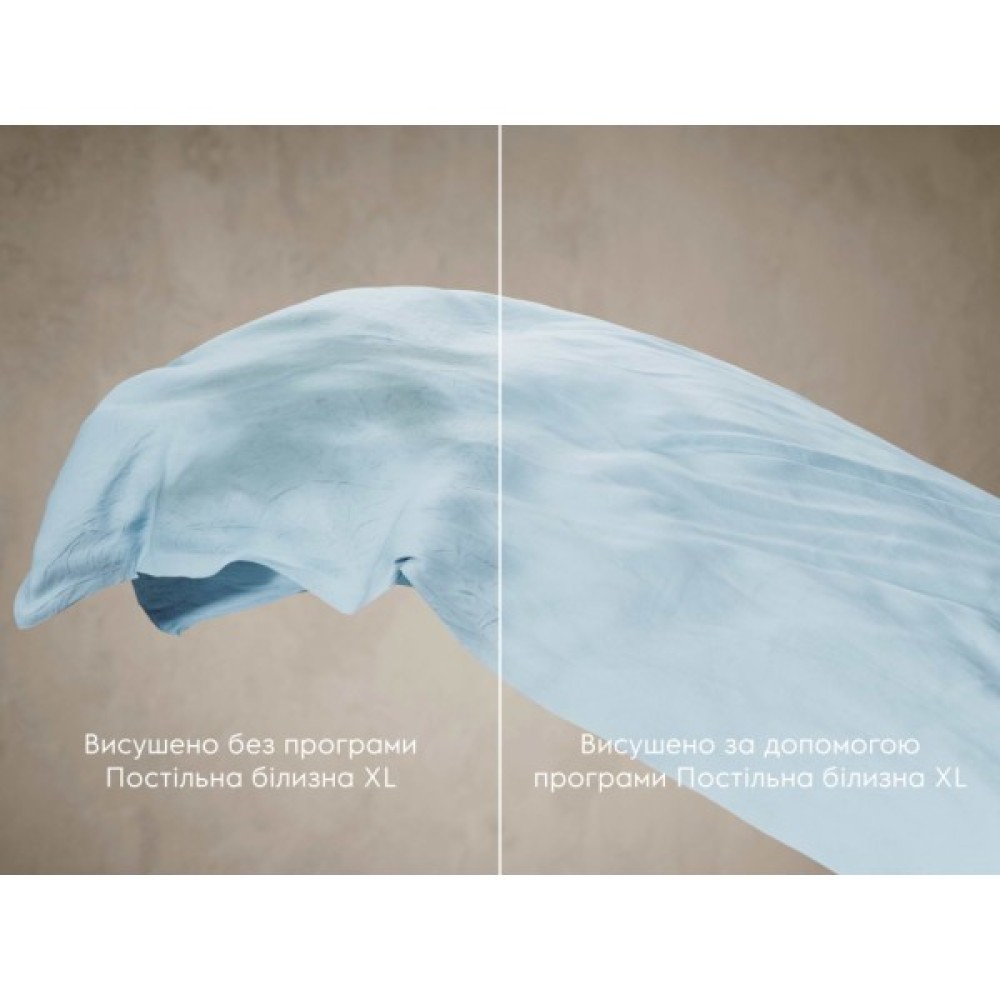 Програма Bedlinen XL забезпечує рівномірні результати сушіння для XL-завантажень, включно з комплектами постільної білизни, без потреби перезапускати сушильну машину.