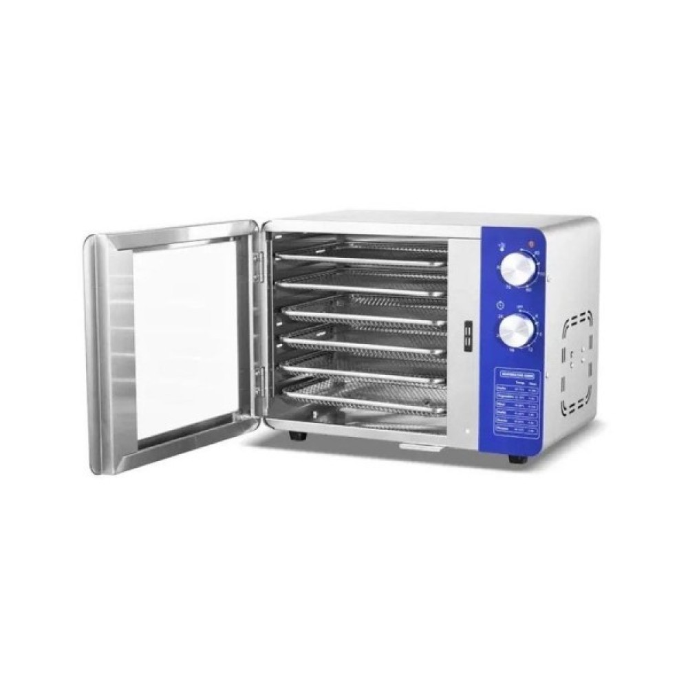 У моделі DH-06M-SS нагрівання відбувається за рахунок нагрівальних елементів, а вентилятор розподіляє гаряче повітря всередині сушарки для продуктів горизонтально, забезпечуючи рівномірне сушіння продуктів.