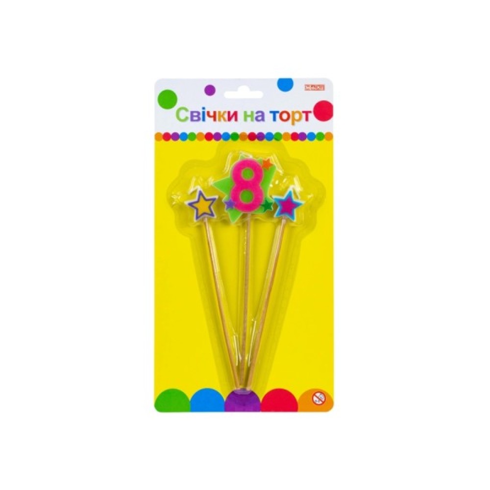 Свічка Maxi Stars "8" висотою 4,5 см — це яскравий декоративний елемент для святкового торта, що надасть вашому святу особливого шарму. У комплекті три свічки, кожна з яких має форму цифри "8" та прикрашена зірочками, що додає їм святкового вигляду. Виготовлені зі стійкого матеріалу, свічки легко встановлюються на торт і добре тримаються. Підійдуть для дня народження, ювілею або будь-якої іншої особливої події.