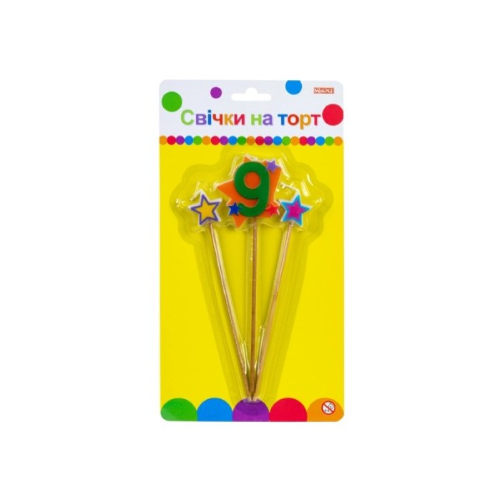 Свічка Maxi Stars "9" висотою 4,5 см (MX620080-9) — це яскравий та святковий елемент для декору торта чи іншого десерту на день народження або тематичну вечірку. У комплекті три свічки з цифрою 9, кожна з яких оздоблена зірочками, що надають виробу веселого вигляду. Виготовлені з якісного воску, свічки легко встановлюються, добре горять і не стікають. Вони допоможуть створити незабутню атмосферу свята та підкреслять значущість події.