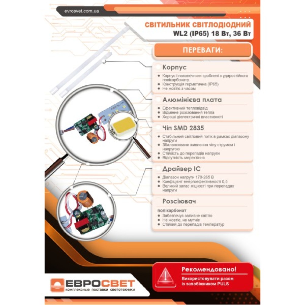 Світильник EVROLIGHT WL2-36-K 36Вт 640 є втіленням інноваційного підходу до освітлення, поєднуючи в собі найвищу якість, передовий дизайн і тривалу надійність. Цей світильник прекрасно підходить для технічних приміщень, завдяки високому рівню вологозахисту та пиленепроникності, які гарантує ступінь захисту IP65. Це дозволяє використовувати його в місцях з підвищеною вологістю, як-то паркінги, виробничі цехи та склади, а також у відкритих просторах під відповідним захистом.