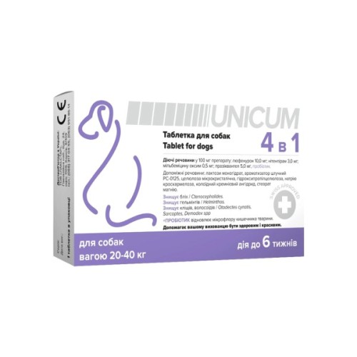Unicum 4 в 1 таблетка протипаразитарна для собак. Протипаразитарний засіб у вигляді таблеток зі смаком яловичини застосовується для профілактики і лікування собак від ектопаразитів (членистоногих: бліх, волосоїдів, вошей, кліщів) та ендопаразитів (нематод, цестод).