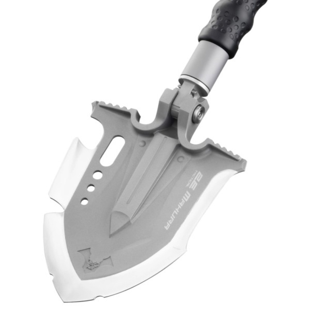 Тактична розбірна лопата-мультитул 2E Mahura Steel Gray вироблена з мартенситної нержавіючої сталі твердості 60 HRC. У комплекті – 23 елементи, які можна швидко та легко збирати та розбирати без надмірних зусиль. Максимальна товщина леза становить 1,3 см. Застосовано унікальну технологію «швидкий замок», яка дає змогу вибрати 7 кутів нахилу лопати в діапазоні від 0 до 150°.