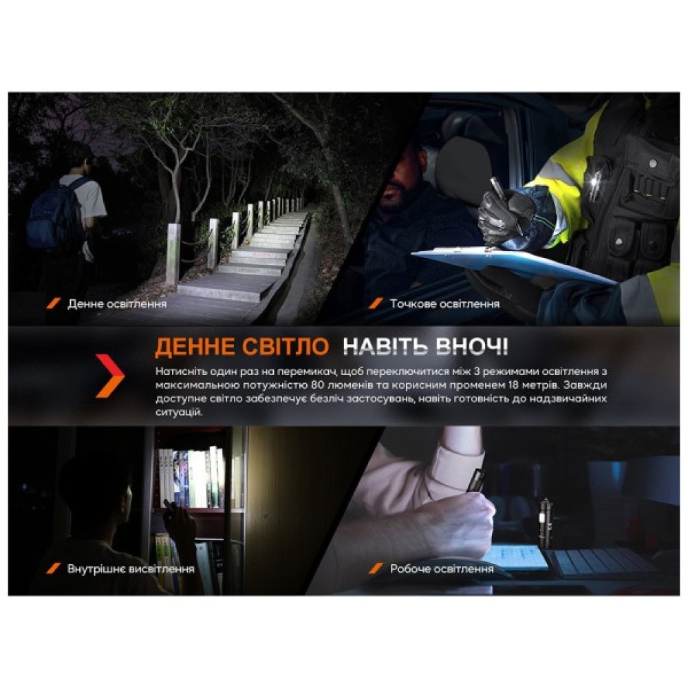 - У заблокованому положенні клацання або натискання кнопки запускає два короткі миготіння на найменшому режимі, щоб вказати на статус блокування. Високий: Максимальний світловий потік, який досягає 80 люменів, на відстані дії променя 18 метрів. Час роботи – 40 хвилин. Інтенсивність освітлення – 82 кандели.