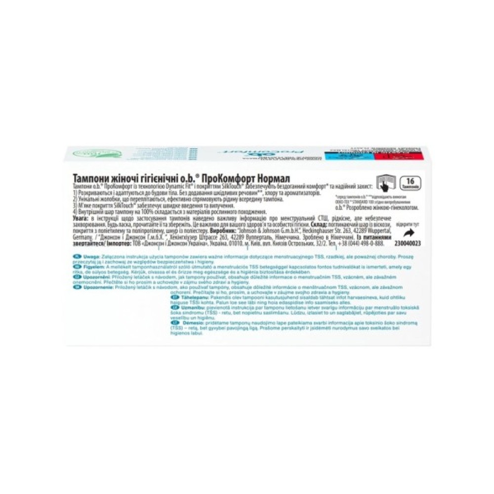 o.b.® ProComfort® забезпечують легке введення і надійний захист завдяки унікальному ** покриттю SilkTouch ™, спеціальним желобкам і новій технології, для ще більш гладкої поверхні тампона o.b.® ProComfort®. Тампони o.b.® ProComfort® Normal є дуже зручними у використанні в дні з незначними і середніми виділеннями, а також для тих, хто тільки починає користуватися тампонами.