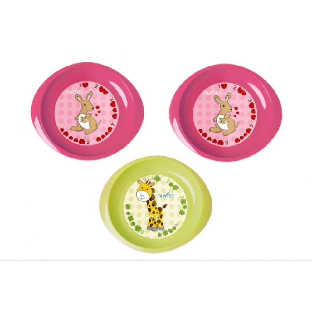 Набір яскравих та розвиваючих тарілочок від італійського бренду Nuvita. У наборі 3 пласкі тарілочки: 2 рожевого кольору та 1 салатового. Їх особливість – яскраві малюнки кенгуру, жирафа та цифр, що відповідають кількості сердечок та листочків. Із таким набором дітлахи в ігровій формі навчаться основам математики. Тарілочки вироблені із міцного та безпечного пластику, що не містить бісфенол-А і фталати. Рекомендовано малюкам з 6 місяців.