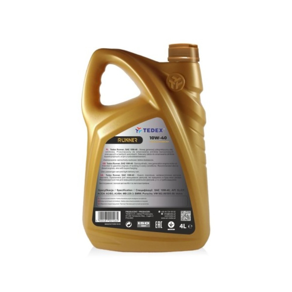 Олива TEDEX RUNNER має в'язкість 10W-40, що гарантує відмінну продуктивність та захист двигуна, незалежно від умов експлуатації. Вона універсальна у використанні - підходить для легкових, вантажних машин, а також для сільгосптехніки і спецтехніки. Продукт відповідає міжнародним стандартам ACEA A3/B4 та API SL/CF, що підтверджує його стійкість до зносу, корозії та високої температури.
