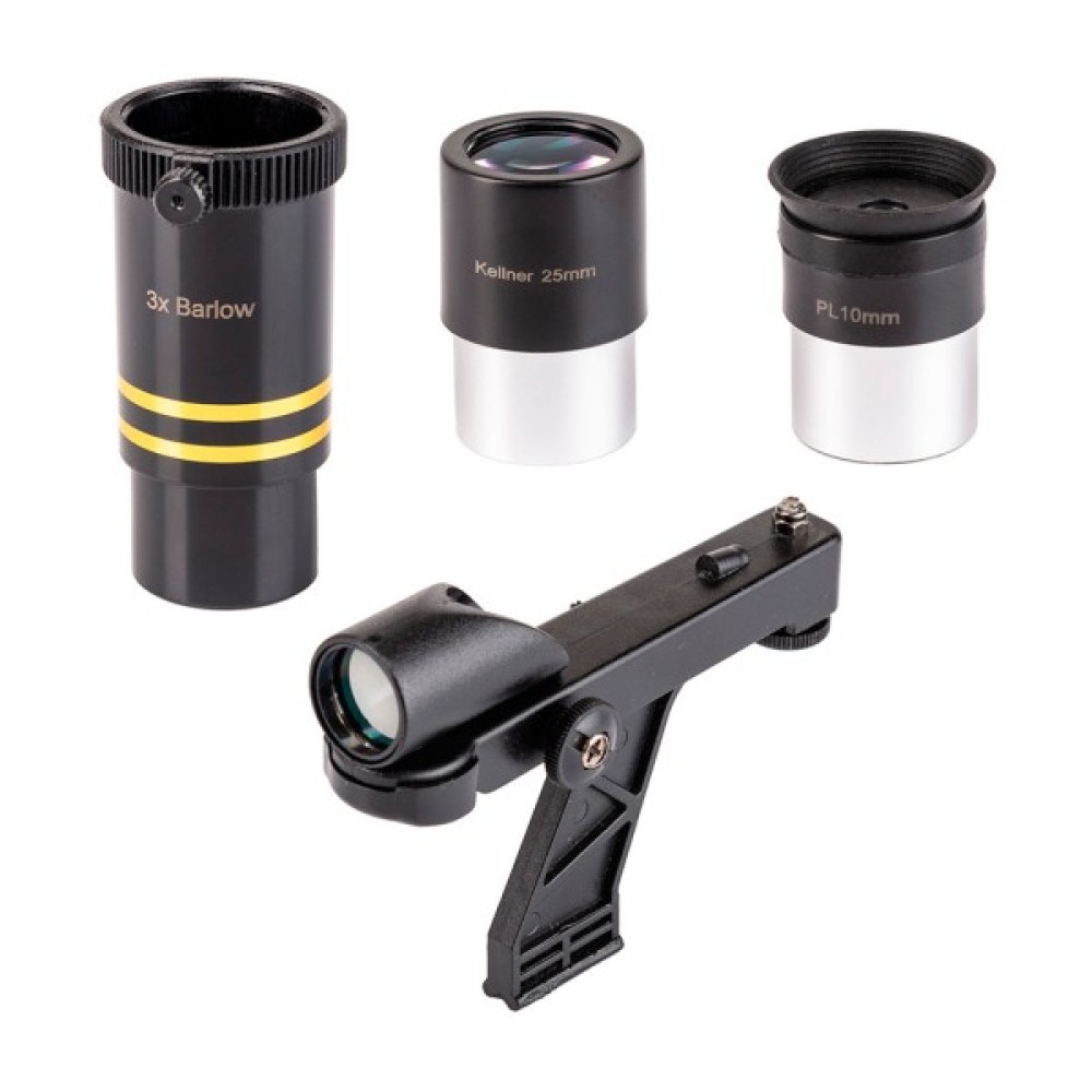 оптична труба; інструкція з експлуатації; окуляри – 2 шт.; лінза барлоу 3x; шукач red dot; монтування: альт-азимутальна; штатив двосекційний сталевий трубчастий 0.6-1.2 м з лотком для аксесуарів.