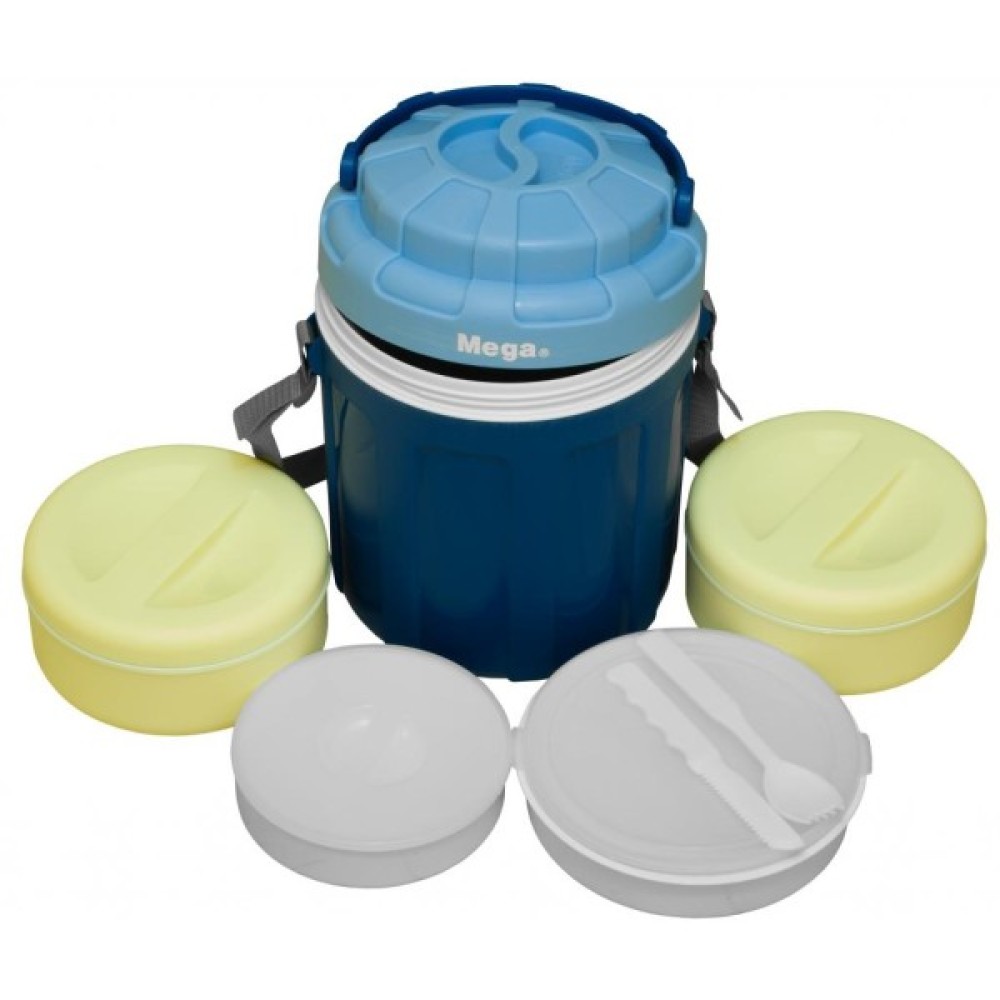 Харчовий термос від американської компанії Mega об'ємом 2,6 літра, виручить вас в поїздку або подорож, зберігши свіжість їжі на довгий час. Такий контейнер стане необхідною річчю для туристів, рибалок і мисливців. Цей чудовий контейнер для їжі має якісне виконання, простий і зручний в експлуатації і здатний тривалий час зберігати температуру поміщених в нього продуктів.Зовнішній шар термоса виготовлений із пластику, а внутрішній - з пластика і термоізоляційної піни, за рахунок чого поміщена в нього їжа збережеться гарячою протягом шести годин. Широке горло дозволить легко наповнювати і мити термос. Термос має чотири зручні пластикові контейнери з кришками, що дозволить розмістити в ньому різні страви. Порадує і наявність зручної ручки і ремінця, які зроблять перенесення більш комфортним. Передбачений в комплекті термоса набір пластикового столового приладу служать відмінним доповненням до його функціональності.Збереження температурного режиму:  - Тепло: до 6 годин.  - Холод: до 24 годин.