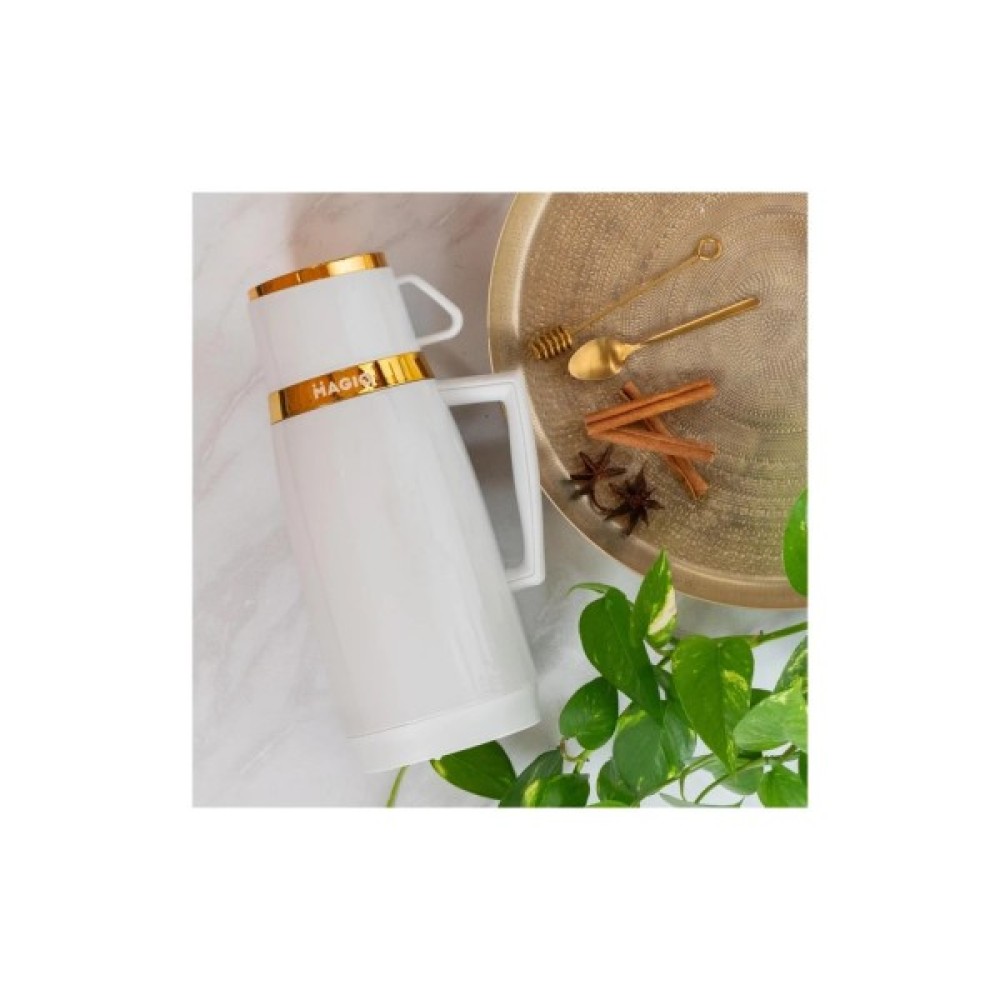 Термос Magio MG-1050W відзначається не лише своєю функціональністю, але й естетичним виглядом. Білий колір корпусу додає елегантності й універсальності, вписуючи термос у будь-який стиль — як жіночий, так і чоловічий. Зручність використання підвищує пластикова ручка, що забезпечує легкість перенесення та надійність при наливанні напою.