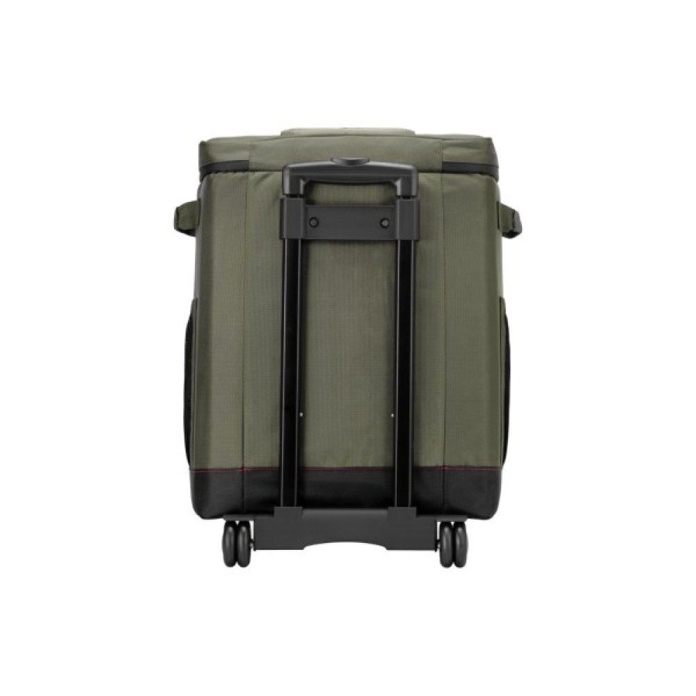 Термосумка на коліщатках темно-оливкового кольору з чорними вставками об’ємом 50 л. Призначена для збереження температури (холодної чи гарячої) напоїв і продуктів. Виготовлено з водовідштовхувального поліестеру. Передбачено телескопічну ручку та ручку на кришці. На лицьовому боці розміщено кишеню на липучці, а також відкривачку для пляшок. Усі карабіни, петлі та замки блискавок – металеві. Зручне та надійне рішення для транспортування. Розмір (ш×в×г): 38 x 49.5 x 27 см.