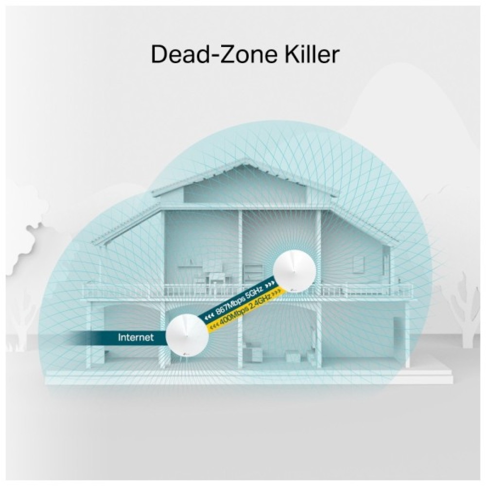 Швидкий і безшовний Wi-Fi. Deco максимально просто забезпечує потужний Wi-Fi в кожній точці вашого будинку. Використовуйте швидке і стабільне з'єднання на площі до 510 кв.м. (3 пристрої) / 350 кв.м. (2 пристрої). Налаштування ще ніколи не була такою простою завдяки мобільному додатку Deco.