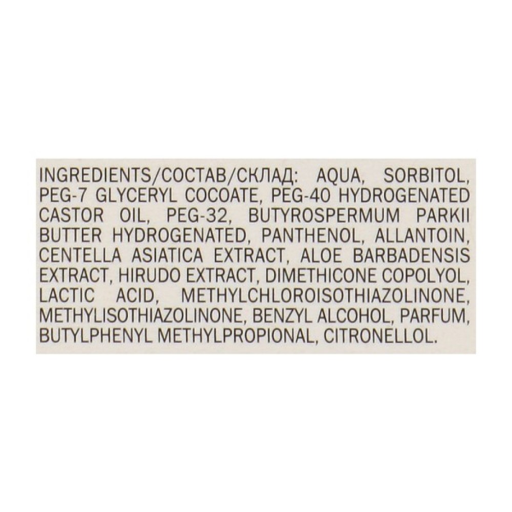 Склад Aqua, Sorbitol, PEG-7 Glyceryl Cocoate, PEG-40 Hydrogenated Castor Oil, PEG-32, Butyrospermum Parkii, Panthenol, Glycyrrhizic Acid, Allantoin, Glycyrriza Glabra, Hirudo Extract, Tocopheryl Acetate, Dimethicone Copolyol, Lactic Acid, Ceteareth-20, Methylchloroisothiazolinone, Methylisothiazolinone, Benzyl Alcohol, Parfum, Butylphenyl Methylpropional, Citronellol.