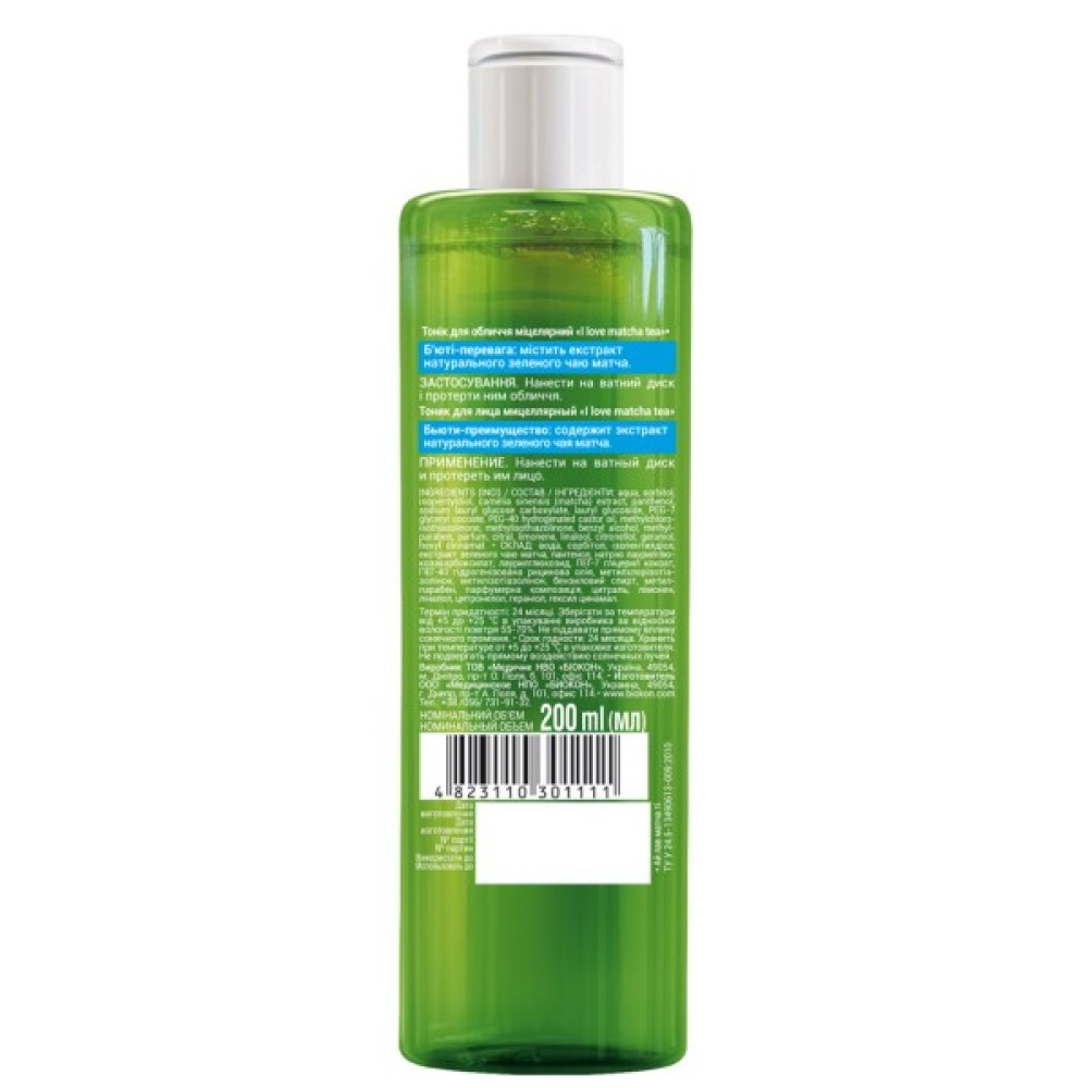 Міцелярний тонік для обличчя I Love Matcha Tea від експертів відомого бренда «Біокон» ідеально завершить етап оищення шкіри обличчя та підготує її до подальших косметичних процедур. Засіб із крихітними мицеллами й екстрактом чаю матчу абсорбує дрібні забруднення, зебезпечує виведення токсинів, нормалізує рівень рН, сприяє бездоганній чистоті, свіжості й комфорту.