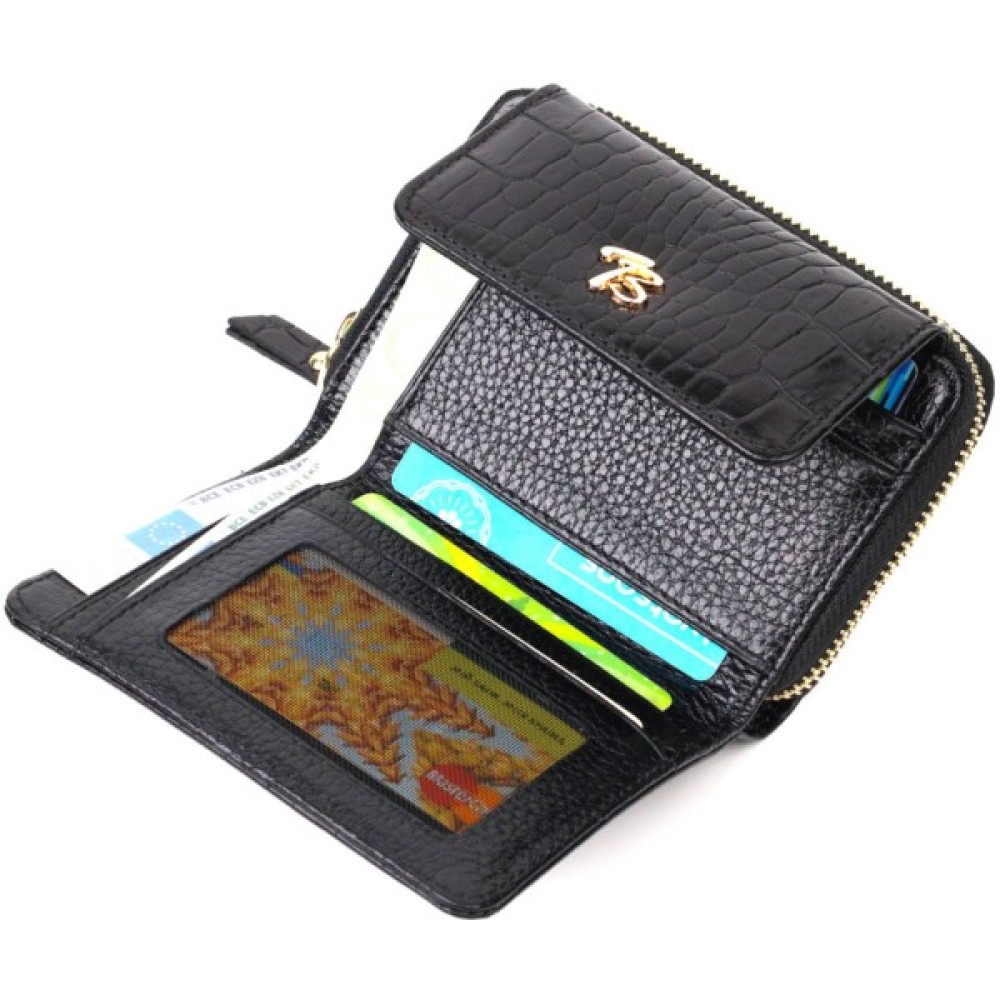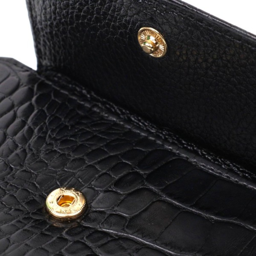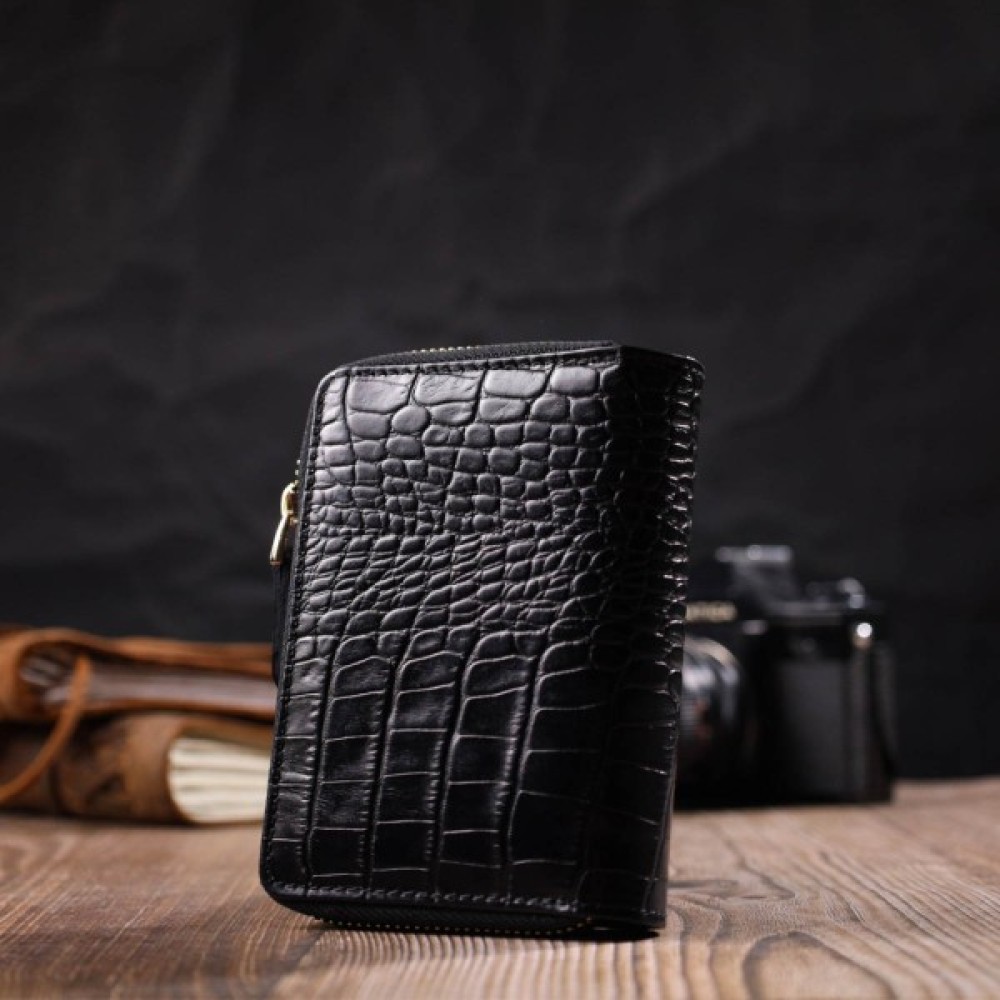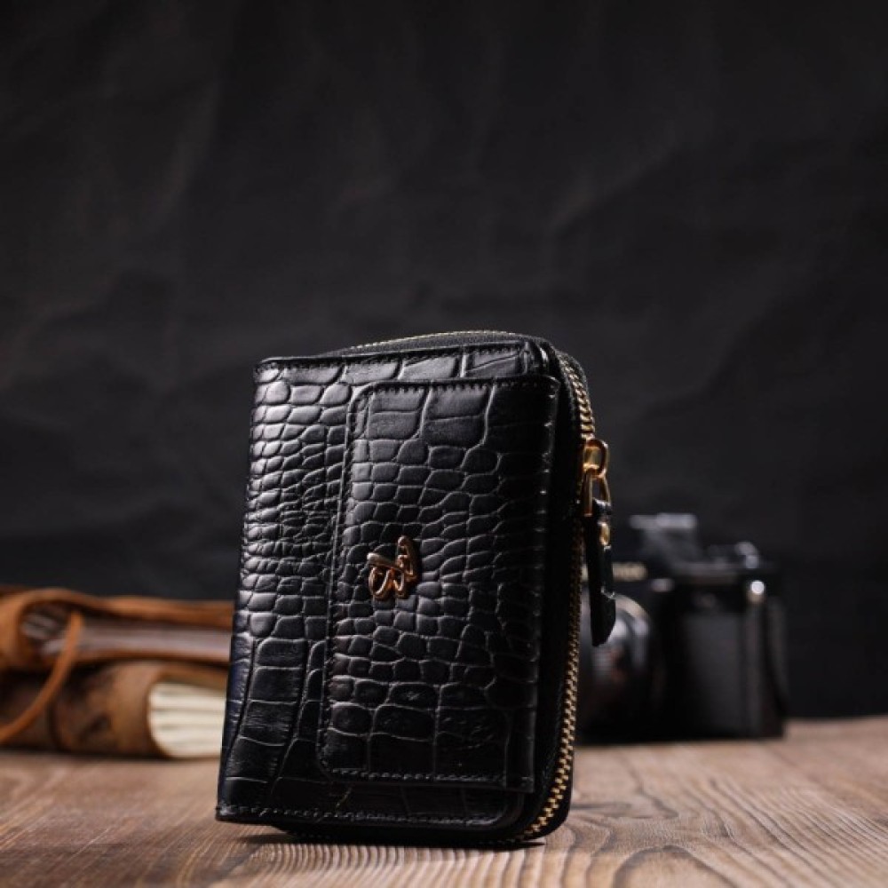 Красивий жіночий гаманець із натуральної шкіри з тисненням під крокодила. Аксесуар складається з двох широких відділень для купюр, трьох осередків для пластикових карток, двох прилеглих кишень та монетниці на блискавці, з кишенею-перегородкою на змійці. У виробі використано якісну фурнітуру золотистого кольору. Закривається гаманець клапаном на кнопку. На клапані всередині золотистий логотип компанії виробника. Купуючи цей шкіряний гаманець, Ви не тільки набуваєте стильної речі, але й отримуєте якісний аксесуар, який прослужить не один рік.