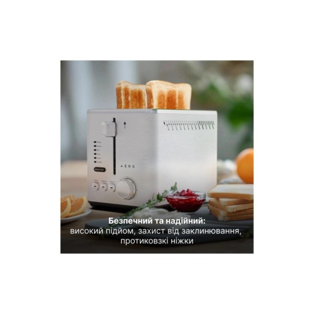 Цей тостер створений для вашого спокою. Завдяки важелю високого підйому ви легко дістанете навіть маленькі шматочки, не ризикуючи обпектися. У разі застрягання тостер автоматично зупиняє роботу, а стійкі нековзні ніжки гарантують, що він залишиться на місці під час використання. Все для вашої зручності й безпеки щодня