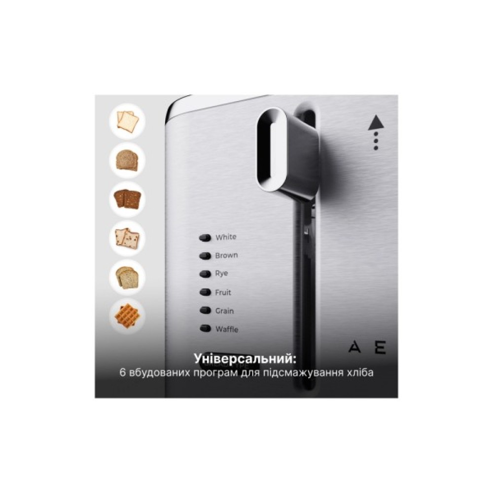 Забудьте про здогадки — тостер сам знає, як краще. Шість попередньо встановлених програм для білого, цільнозернового хліба, бейглів, вафель та інших варіантів, автоматично налаштовують час і температуру. Просто оберіть тип хліба, натисніть кнопку — і насолоджуйтесь ідеальним результатом щоразу