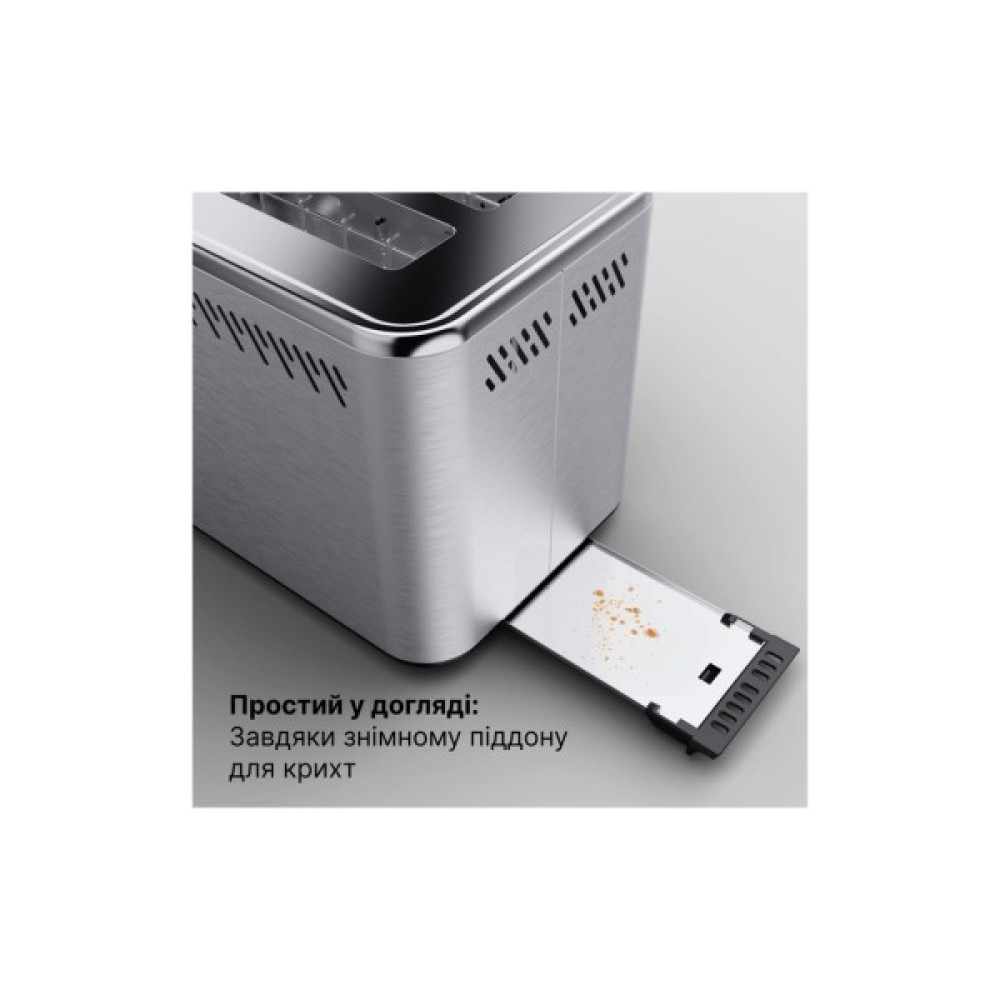 Прибирання більше не проблема — знімний піддон для крихт дозволяє легко підтримувати тостер у чистоті. Достатньо висунути, витрусити й повернути на місце. Жодних підгорілих залишків і безладу на кухні — тільки чистота й приємний початок дня