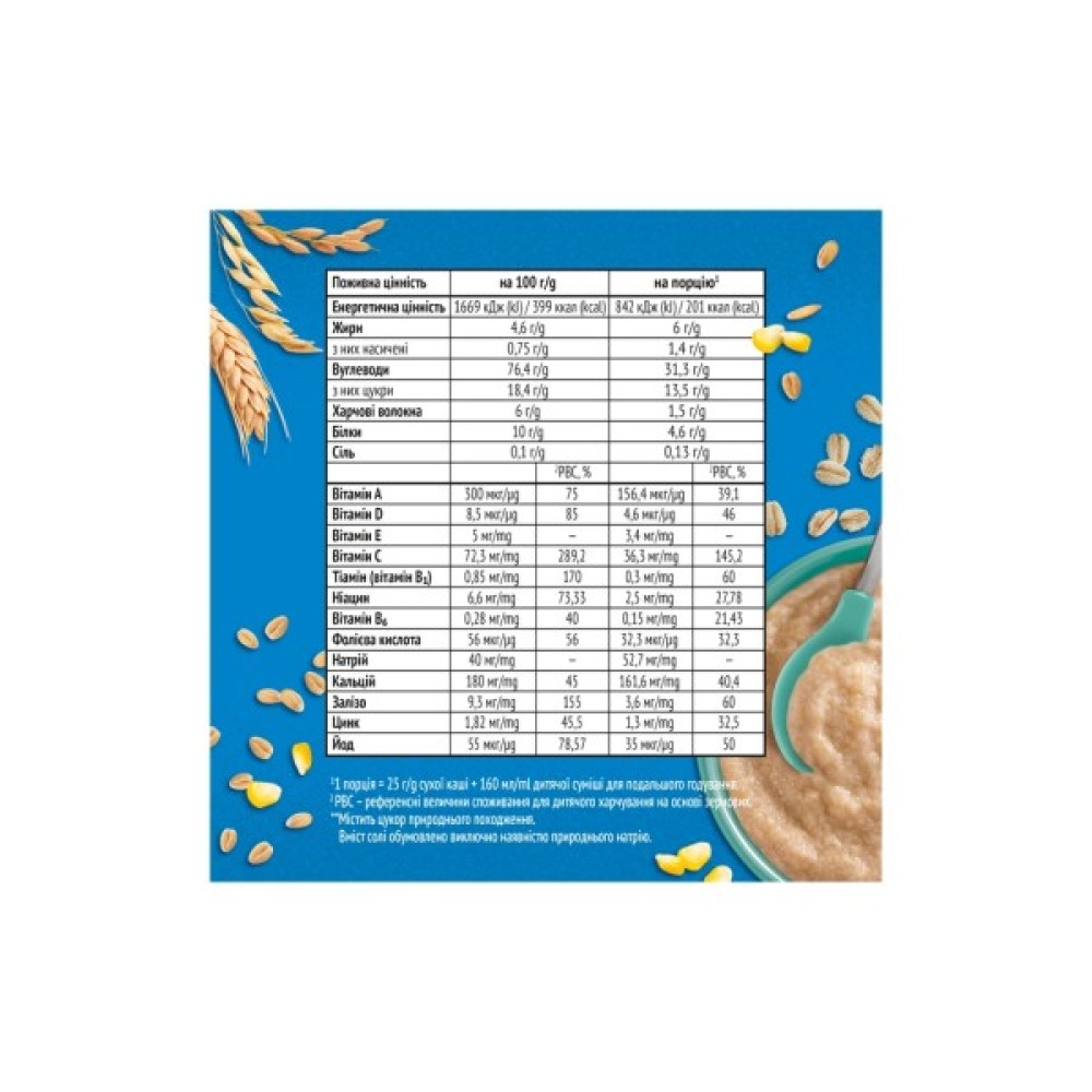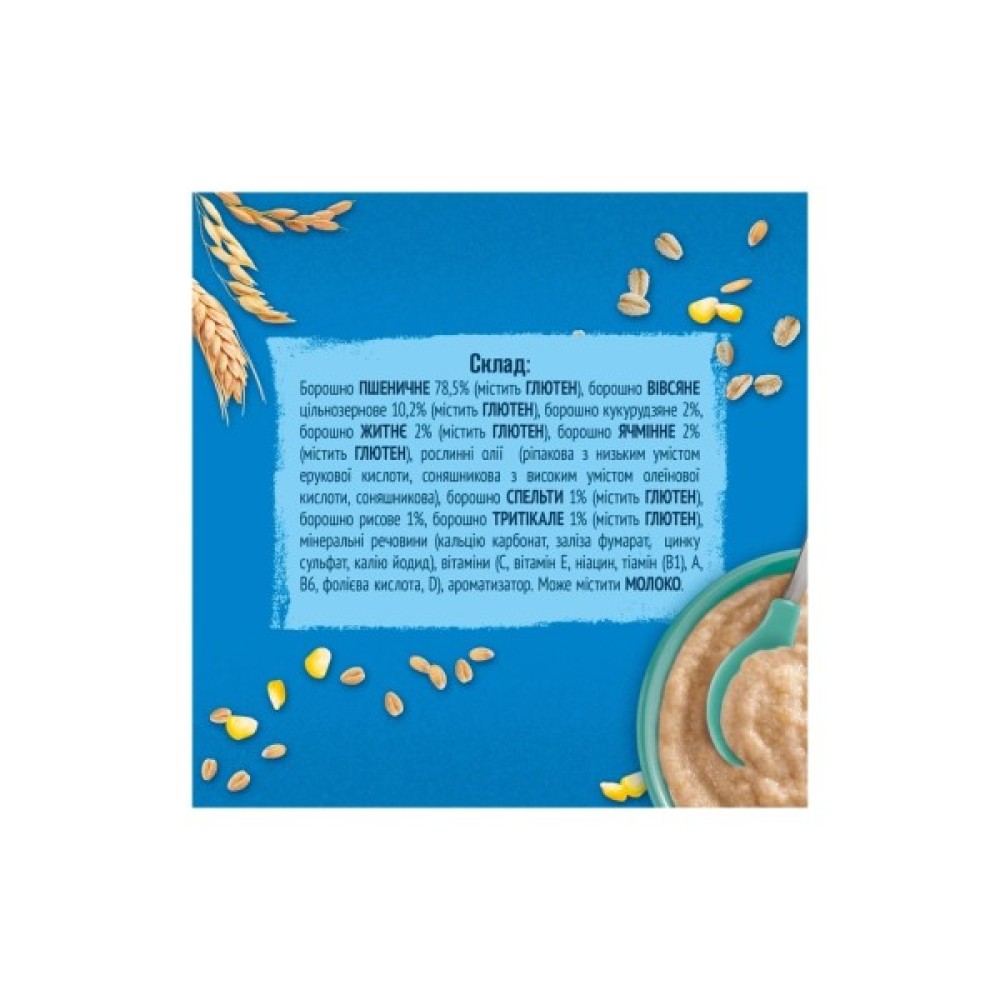 Склад: борошно пшеничне 78.5% (містить глютен), борошно вівсяне цільнозернове 10.2% (містить глютен), борошно кукурудзяне 2%, борошно житнє 2% (містить глютен), борошно ячмінне 2% (містить глютен), рослинні олії (ріпакова з низьким умістом ерукової кислоти, соняшникова з високим умістом олеїнової кислоти, соняшникова), борошно Спельти 1% (містить глютен), борошно рисове 1%, борошно трикале 1% (містить глютен), мінеральні речовини (кальцію карбонат, заліза фумарат, цинку сульфат, калію йодид), вітаміни (С, вітамін Е, ніацин, тіамін (В1), А, В6, фолієва кислота, D), ароматизатор. Може містити Молоко.