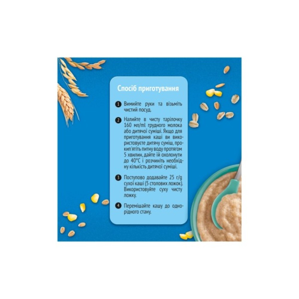 Не варити! Годуйте дитину чистою ложкою. Кашу слід готувати безпосередньо перед кожним годуванням. Не зберігайте розведену кашу, що залишилась після годування.