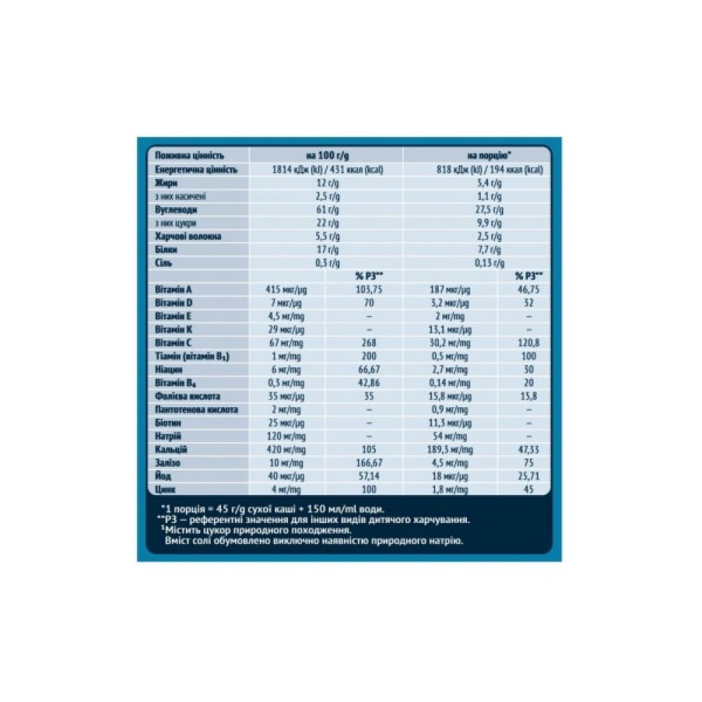 До складу входять: 32,6% вівсяного цільнозернового борошна з глютеном, 29,6% пшеничного борошна з глютеном, 18% сухого знежиреного молока, 9% сухого цільного молока, 8% житнього борошна з глютеном, рослинні олії (ріпакова з низьким вмістом ерикової кислоти, соняшникова з високим вмістом олеїнової кислоти), вітаміни С, Е, В1, А, В6, К, D, кальцію карбонат, заліза фумарат, ніацин, сульфат цинку, пантотенова кислота, фолієва кислота, біотин, йодином калію, інулін.
