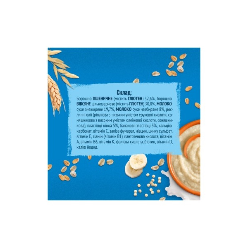 Суха молочна пшенично-вівсяна каша Gerber з кіноа та бананами допоможе познайомити малюка з глютеном.