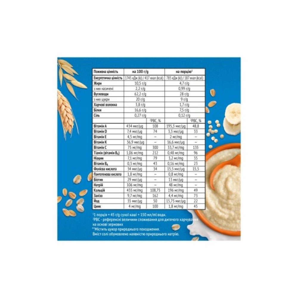 Склад: борошно пшеничне 78.5% (містить глютен), борошно вівсяне цільнозернове 10.2% (містить глютен), борошно кукурудзяне 2%, борошно житнє 2% (містить глютен), борошно ячмінне 2% (містить глютен), рослинні олії (ріпакова з низьким умістом ерукової кислоти, соняшникова з високим умістом олеїнової кислоти, соняшникова), борошно Спельти 1% (містить глютен), борошно рисове 1%, борошно трикале 1% (містить глютен), мінеральні речовини (кальцію карбонат, заліза фумарат, цинку сульфат, калію йодид), вітаміни (С, вітамін Е, ніацин, тіамін (В1), А, В6, фолієва кислота, D), ароматизатор. Може містити Молоко.