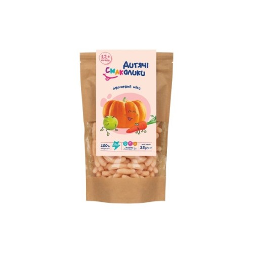 Склад: борошно сочевичне, борошно кукурудзяне, олія соняшникова високоолеїнова дезодорована рафінована, яблуко сублімоване порошкоподібне, морква сушена порошкоподібна, гарбуз сушений порошкоподібний, перець солодкий сушений порошкоподібний, сіль гімалайська, суміш вітамінів (А, D, E, C, PP, B1, Β2, Β6, Β12, фолієва кислота, пантотенат, біотин)