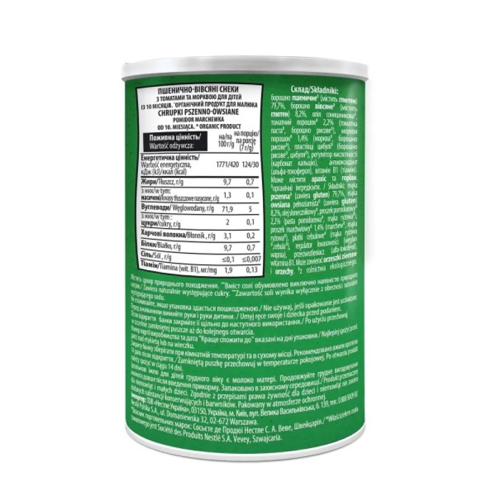 Пшенично-вівсяні снеки Gerber Organic з томатами й морквою — корисний перекус у зручному форматі. Снеки легко тануть у роті, їх зручно тримати в маленькій ручці. Такий перекус чудовий для першого досвіду дитини їсти самостійно.