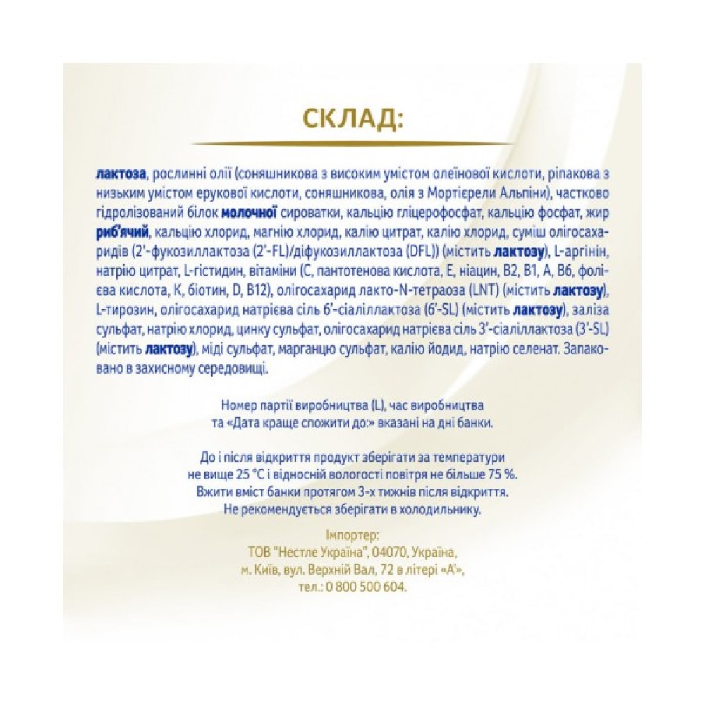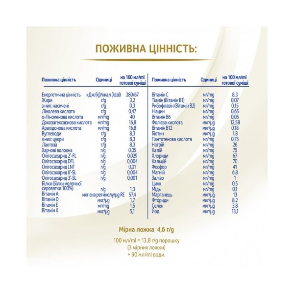 Склад: лактоза, рослинні олії (соняшникова з високим умістом олеїнової кислоти, ріпакова з низьким умістом ерукової кислоти, соняшникова, олія з Мортієрели Альпіни), частково гідролізований білок молочної сироватки, кальцію гліцерофосфат, кальцію фосфат, жир риб’ячий, кальцію хлорид, магнію хлорид, калію цитрат, калію хлорид, суміш олігосахаридів (2'-фукозиллактоза (2’-FL)/діфукозиллактоза (DFL)) (містить лактозу), L-аргінін, натрію цитрат, натрію гідроксид, L-гістидин, вітаміни (С, пантотенова кислота, Е, ніацин, В2, В1, А, В6, фолієва кислота, К, біотин, D, В12), олігосахарид лакто-N-тетраоза (LNT) (містить лактозу), L-тирозин, олігосахарид натрієва сіль 6’-сіаліллактоза (6’-SL) (містить лактозу), заліза сульфат, натрію хлорид, цинку сульфат, олігосахарид натрієва сіль 3’-сіаліллактоза (3’-SL) (містить лактозу), міді сульфат, марганцю сульфат, калію йодид, натрію селенат.