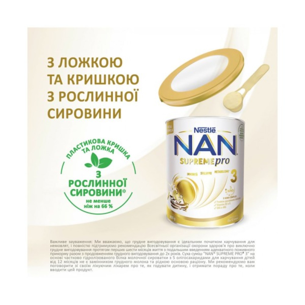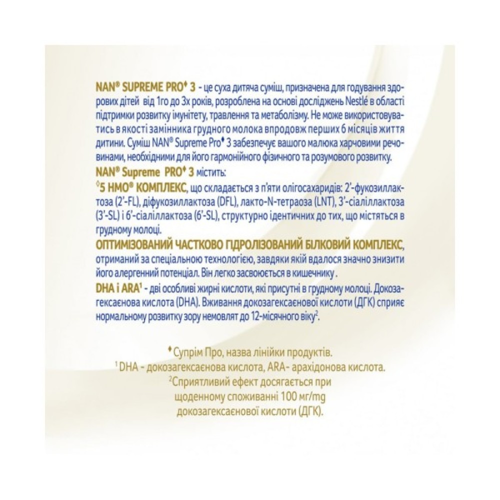 Суха суміш NAN Supreme Pro 3 — це суха дитяча суміш, призначена для годування здорових дітей від 1го до 3х років, розроблена на основі досліджень Nestlé в області підтримки розвику імунітету, травлення та метаболізму. Не може використовуватись в якості замінника грудного молока впродовж перших 6 місяців життя дитини. Суміш NAN SUPREME PRO 3 забезпечує вашого малюка харчовими речовинами, необхідними для його гармонійного фізичного та розумового розвитку.