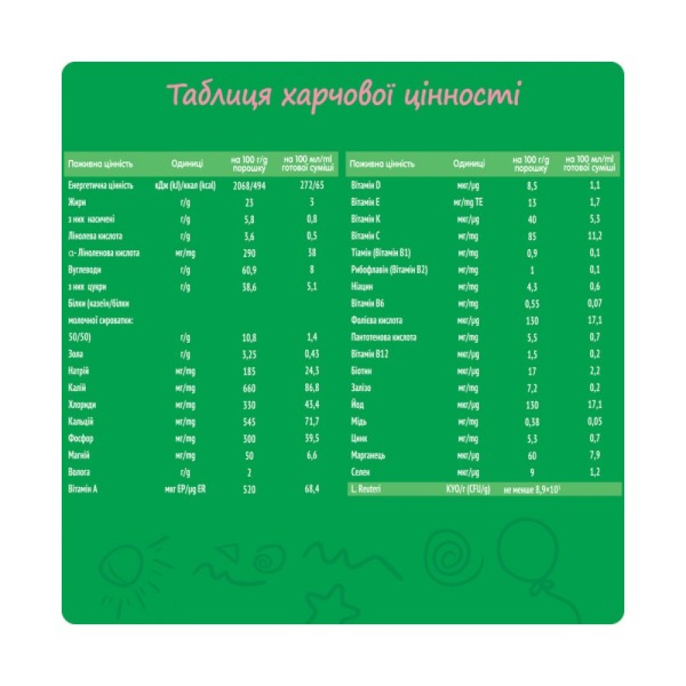 Склад: молоко знежирене (75%), мальтодекстрин, сироватка молочна, рослинні олії (соняшникова з високим вмістом олеїнової кислоти, кокосова, ріпакова з низьким вмістом ерукової кислоти, соняшникова), лактоза, цитрат кальцію, емульгатор (лецитин соєвий), цитрат натрію, цитрат калію, хлорид калію, фосфат кальцію, цитрат магнію, вітаміни (С, E, пантотенова кислота, ніацин, тіамін (В1), А, В6, рибофлавін (В2), фолієва кислота, K, біотин, D, В12), фосфат калію, сульфат заліза, сульфат цинку, культура лактобактерій Lactobacillus Reuteri (не менше 8,9х105 КУО/г), сульфат міді, йодид калію, селенат натрію. Запаковано в захисному середовищі.