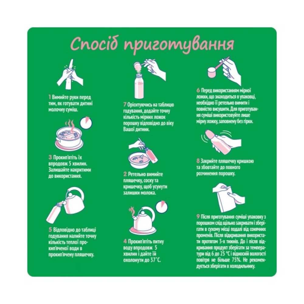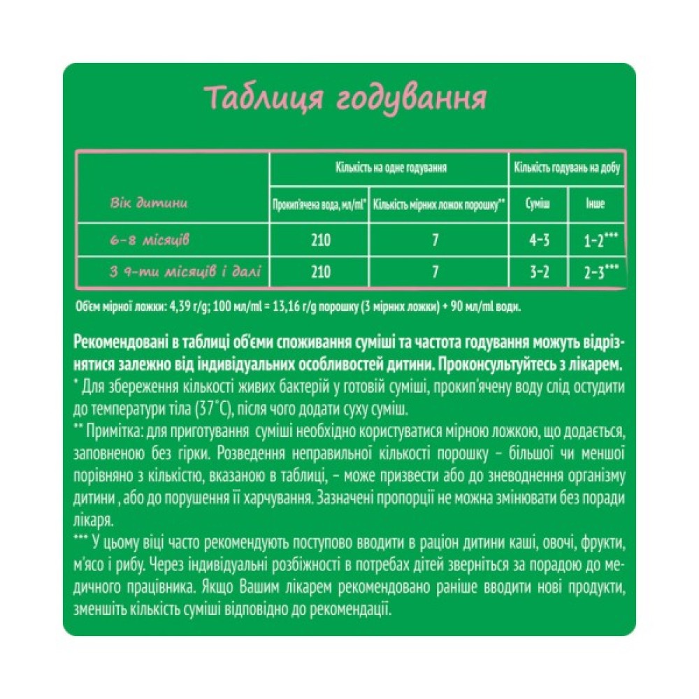 Попередження: суміш слід готувати безпосередньо перед кожним годуванням. Точно дотримуйтесь інструкції. Готова суміш, що залишилася після годування, не повинна зберігатися і використовуватись в подальшому. Для збереження кількості живих бактерій у готовій суміші, прокип'ячену воду слід остудити до температури тіла (37˚С), після чого додати суху суміш. Для приготування суміші необхідно користуватися мірною ложкою, що додається, заповненою без гірки. Розведення неправильної кількості порошку може призвести або до зневоднення організму дитини, або до порушення її харчування. Зазначені пропорції не можна змінювати без поради лікаря.
