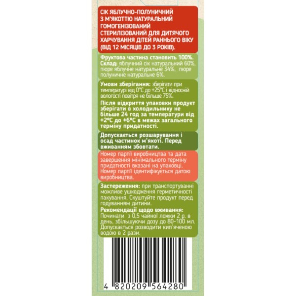 Сік дитячий Galicia Baby яблучно-полуничний з м’якоттю натуральний 200 мл (4820209564280)