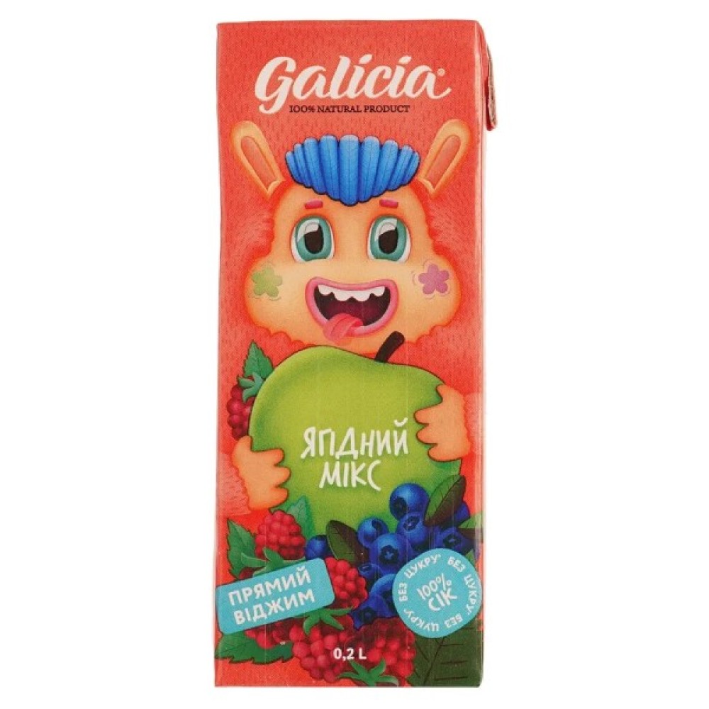 Сік з м'якоттю Galicia Ягідний мікс - повністю натуральний сік з суміші яблук, малини, брусниці і чорниці.