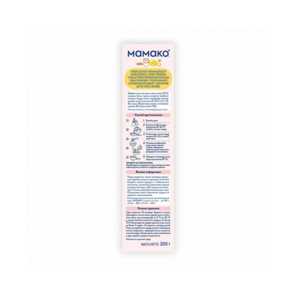 Каша на козячому молоці Мамако пшенична з грушею і бананом виготовлена за спеціальною рецептурою. Пшенична крупа має високу поживну цінність і славиться загальнозміцнюючими властивості, що особливо корисно для дітей з поганим апетитом. Велика кількість натуральних вітамінів групи B в пшениці і груші, а також амінокислота триптофан, яка міститься в банані, покращують настрій. Натуральні фрукти надають каші яскравий смак, перетворюють її в апетитне і корисне лакомство. Високий вміст козячого молока (32 %) в кожній каші Мамако покращує поживну цінність продукту, збільшує біодоступність макро- і мікроелементів.