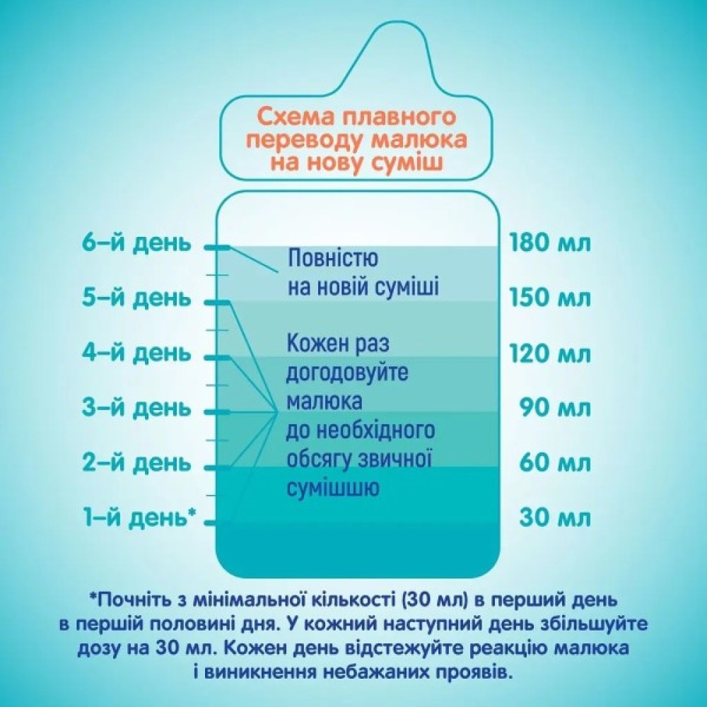 4. Чітко дотримуючись таблиці годування, додайте точну кількість води, а потім мірних ложок порошку відповідно до віку Вашої дитини. Використовуйте мірну ложечку, що знаходиться в банці, заповнену без гірки.