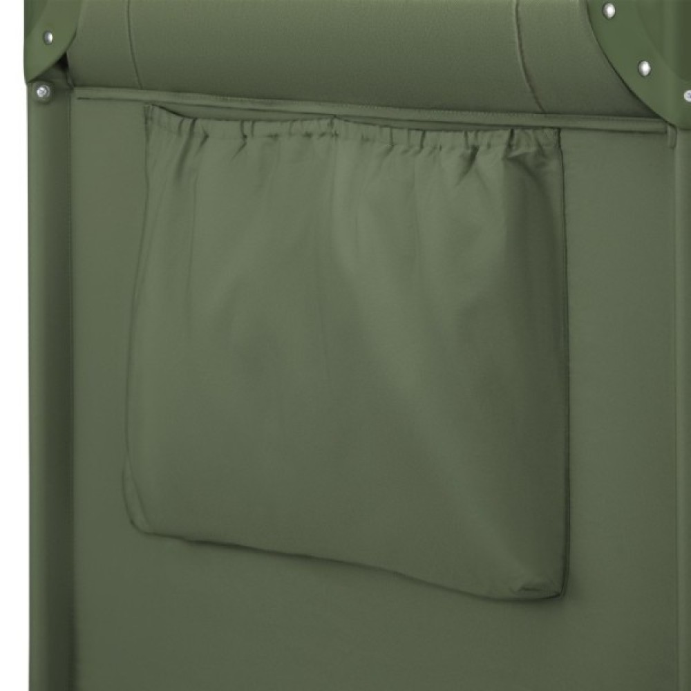 Ліжечко оснащене бічною панеллю на блискавці, що дозволяє старшим дітям забиратися в неї самостійно. Це гарантує, що батьки не будуть напружувати спину щоразу, коли кладуть малюка. Також є зручна кишеня для зберігання додаткових підгузків, іграшок чи серветок. До комплекту входить дорожня сумка для додаткової зручності. Ліжечко виготовлене з тканого матеріалу високої щільності для максимальної міцності.