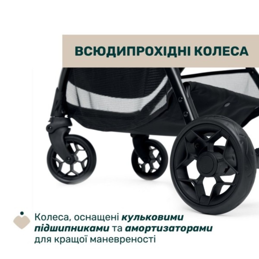 - Високоякісні колеса з амортизаторами та кульковими підшипниками забезпечують плавний рух та безперешкодне пересування по будь-якій поверхні. Поворотні передні колеса з системою блокування забезпечують високу маневреність та просте керування.