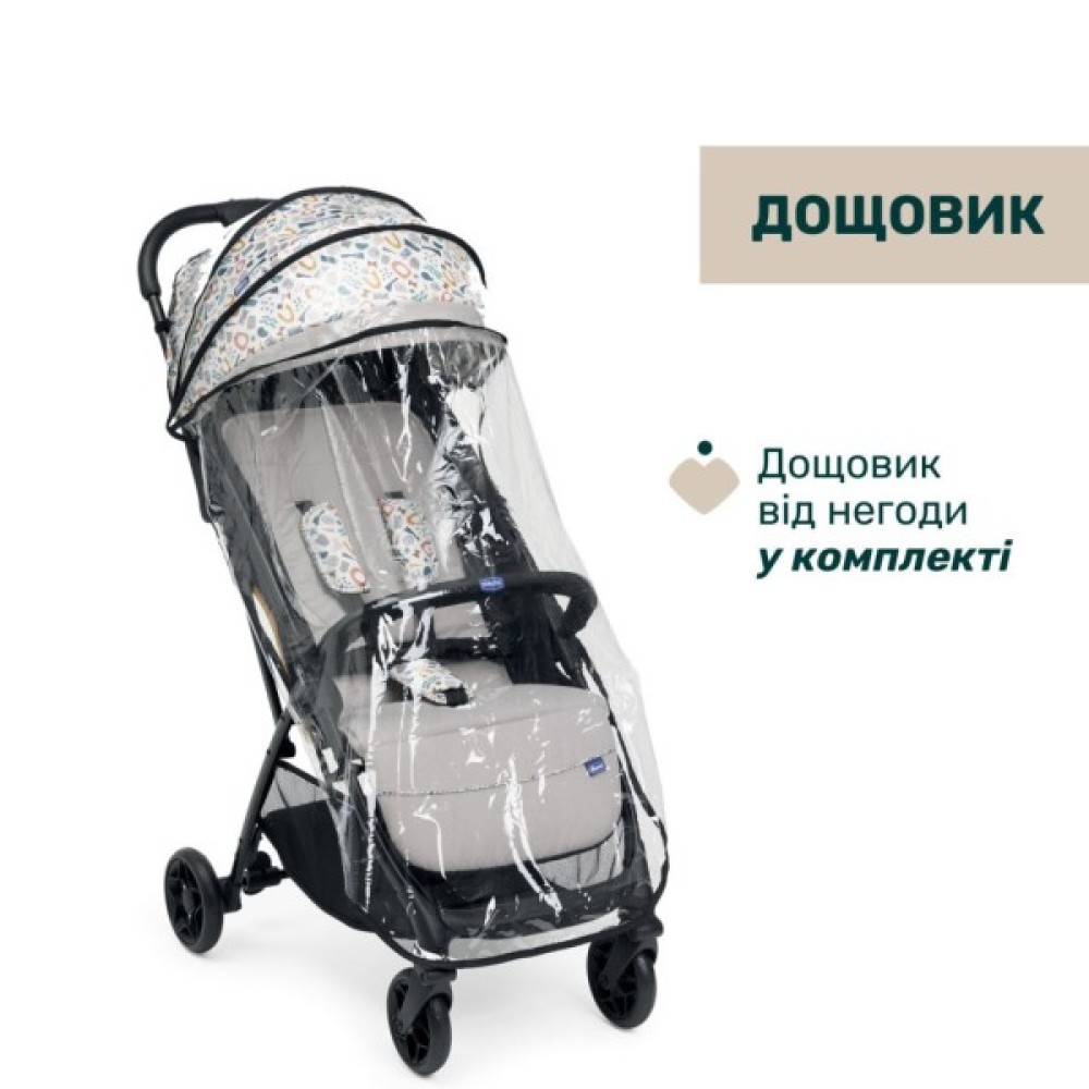 • Дощовик, що входить до комплекту повністю покриває коляску для максимального захисту в вітряні або похмурі дні.