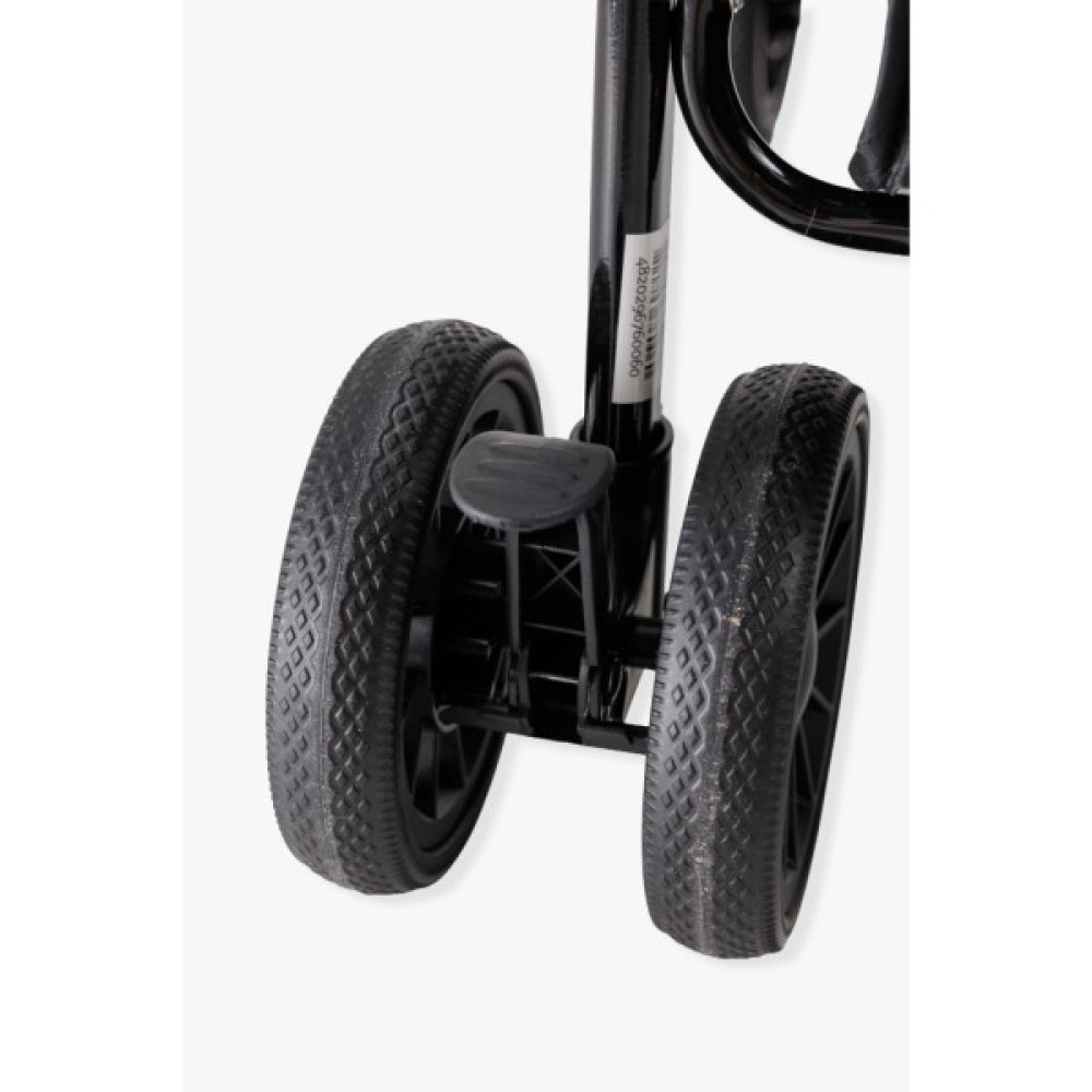 Коляска оснащена чотириколісною шасі з передніми поворотними колесами, що забезпечує легкість управління та маневреність. Колеса виготовлені з поліуретану, діаметром 13 см, що гарантує плавний та безшумний хід навіть по нерівних поверхнях. Сталева рама надає конструкції міцності та довговічності.