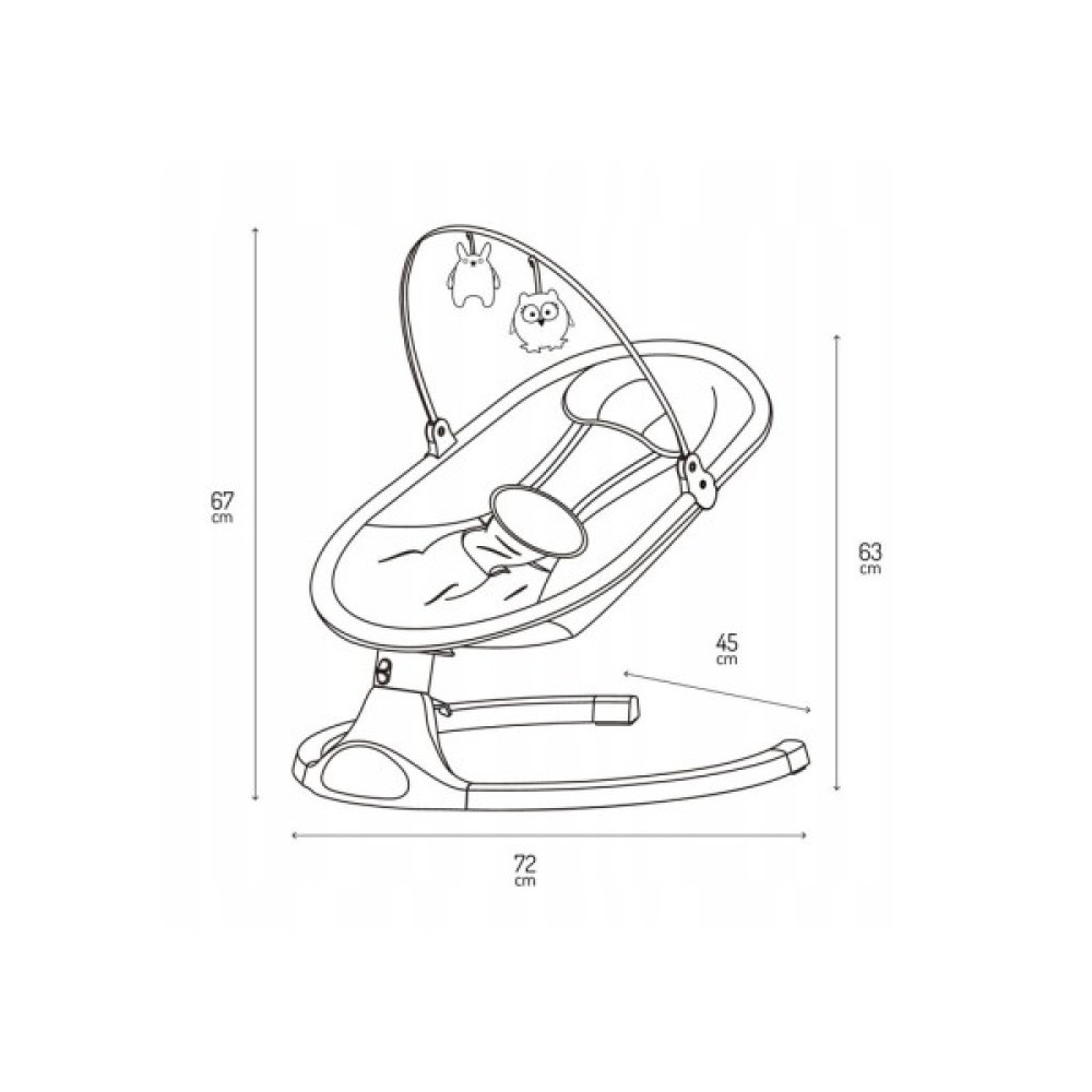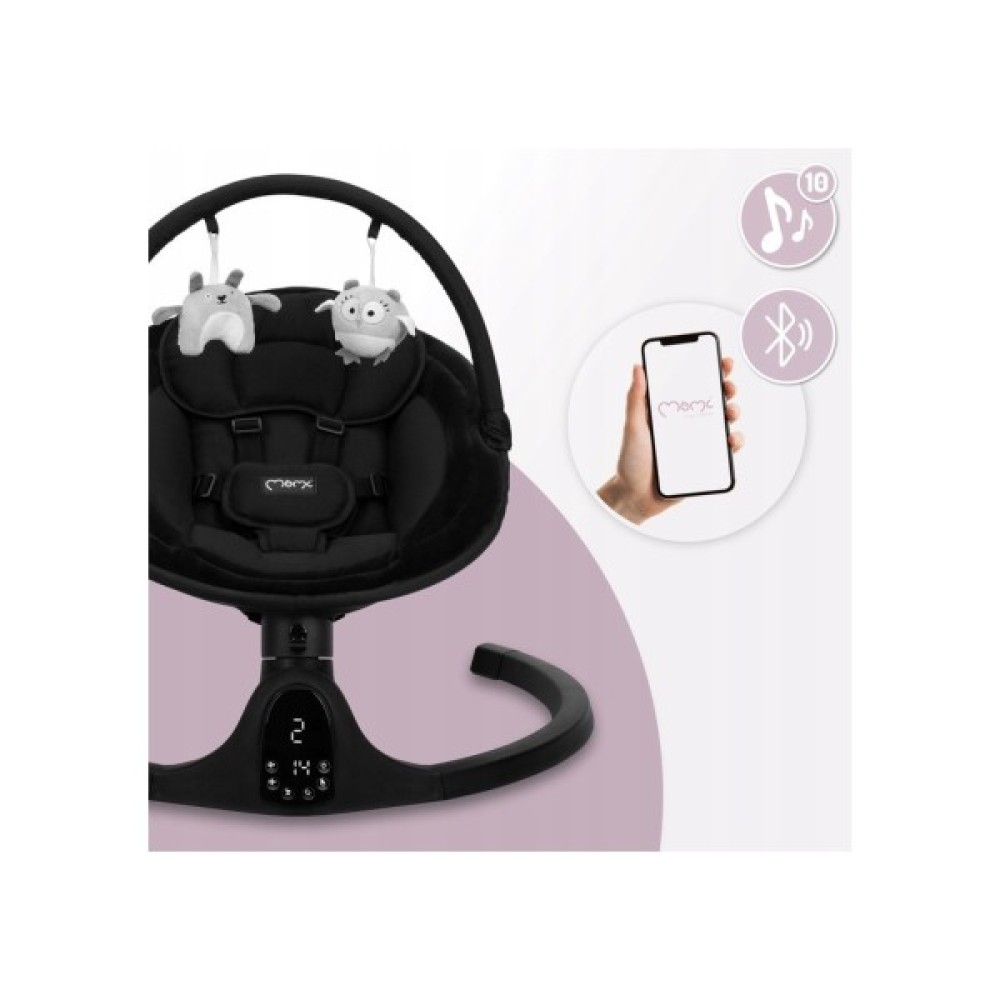 MoMi Kenani Onyx також оснащений пультом дистанційного керування, тому ви можете легко керувати гойдалкою, не підходячи до неї, можете встановити час гойдання 8, 15 або 30 хвилин, увімкнути музику.
