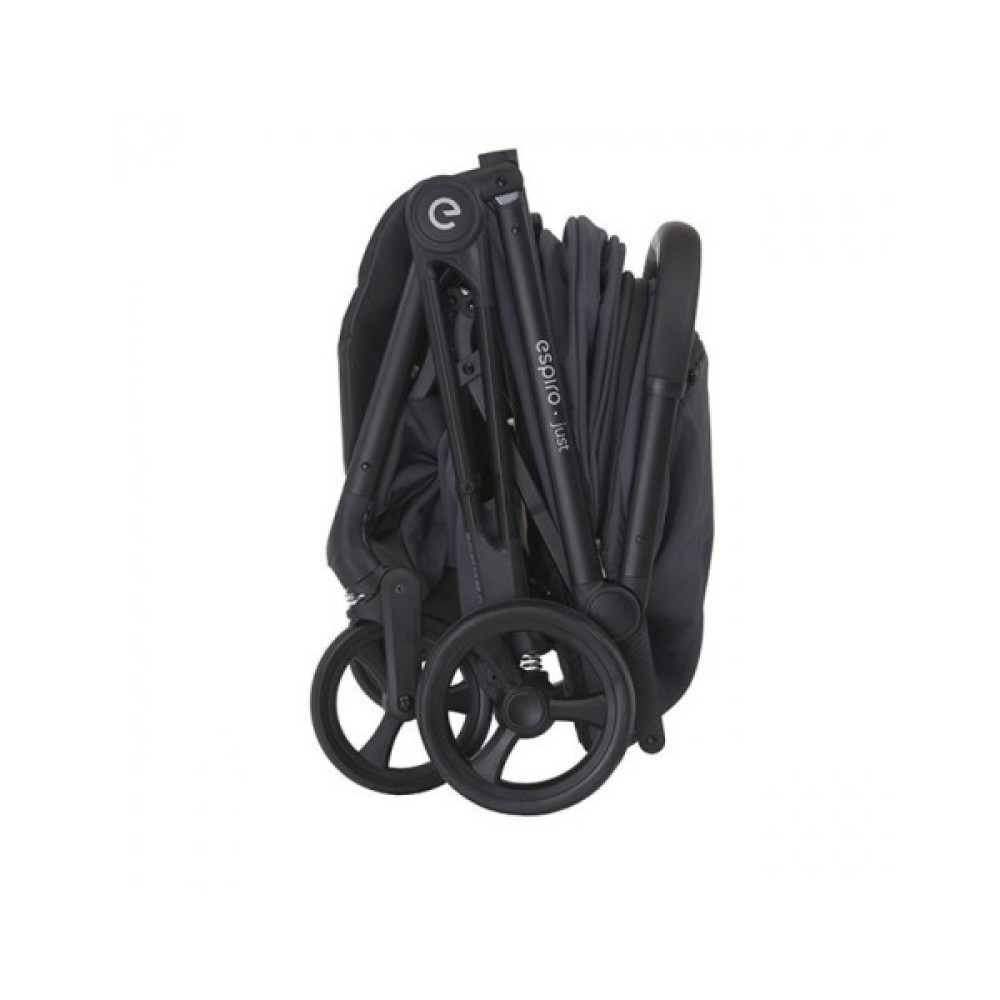 Коляска Espiro Just обладнана механізмом автоматичного складання Автофолдінг, з яким візочок складається одним рухом. Коляска мало важить, що полегшує її перенесення та підйом. Компактна форма дозволяє зберігати коляску Just будь-де. Проте, не дивлячись на малу вагу і компактність, коляска обладнана всім необхідним: великим зручним сидінням з капюшоном, задня частина якого має панорамну вентиляцію, 5-точкові паски безпеки, які кріпляться на магнітну пряжку, повноцінну амортизацію, зручний кошик для речей і підстаканник.