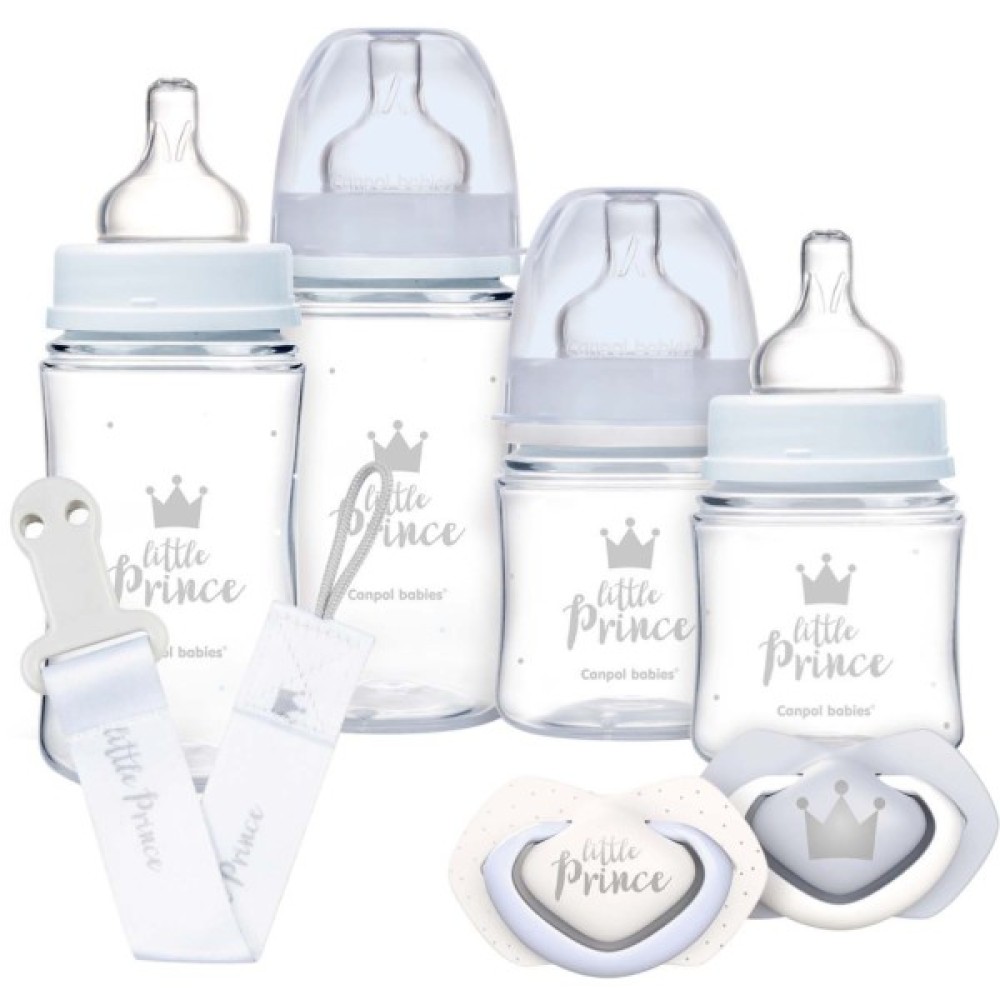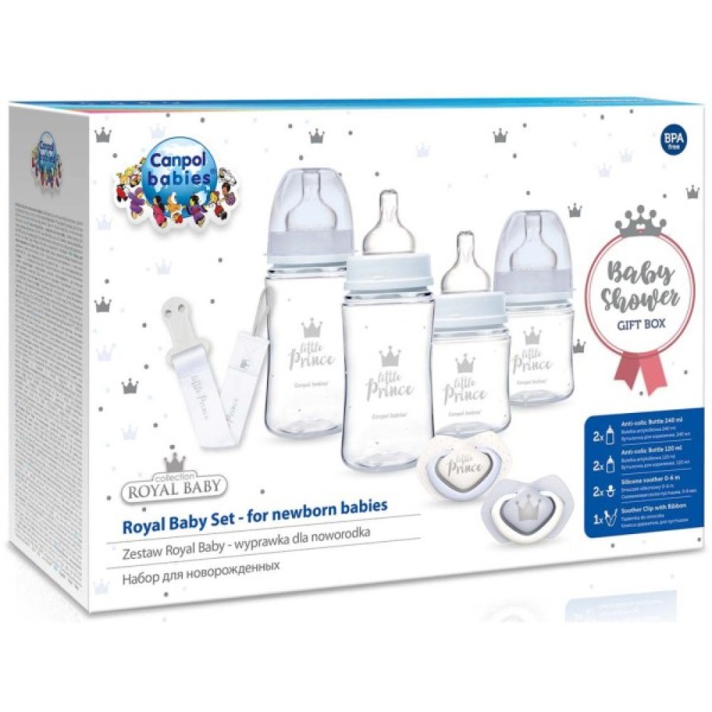 Набір для новонароджених Royal Baby від Canpol Babies – набір дитячих аксесуарів для немовляти. Він включає пляшечки для годування двох розмірів та пустушку для новонародженого з ланцюжком. Запакований в елегантне впакування і це ідеальний варіант подарунка. Полегшує поєднання грудного вигодовування та годування з пляшечки. Ефективний антиколіковий клапан запобігає утворенню бульбашок у їжі, сприяє виходу повітря та зменшує ризик виникнення кольк. Соска виготовлена ​​з м'якого та безпечного силікону.