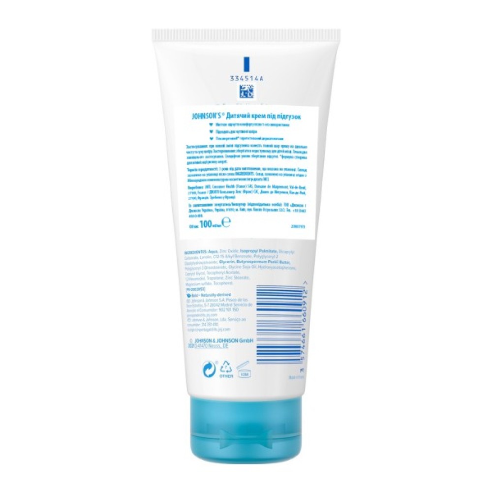 Дитячий крем під підгузок Johnson's містить натуральні екстракти листя оливи, цинк і олію ши. Він допомагає відновити і зміцнити захисний бар'єр шкіри. Ніякого почервоніння та висипу! Крем під підгузок з цинком має приємну консистенцію і легко наноситься. Його формула гіпоалергенна і протестована дерматологами. Для профілактики утворення почервоніння, подразнень і попрілостей під підгузком важливо дотримуватися інтервалів між його заміною - не більше 3-4 годин. Крем Johnson's® слід наносити на суху і чисту шкіру.