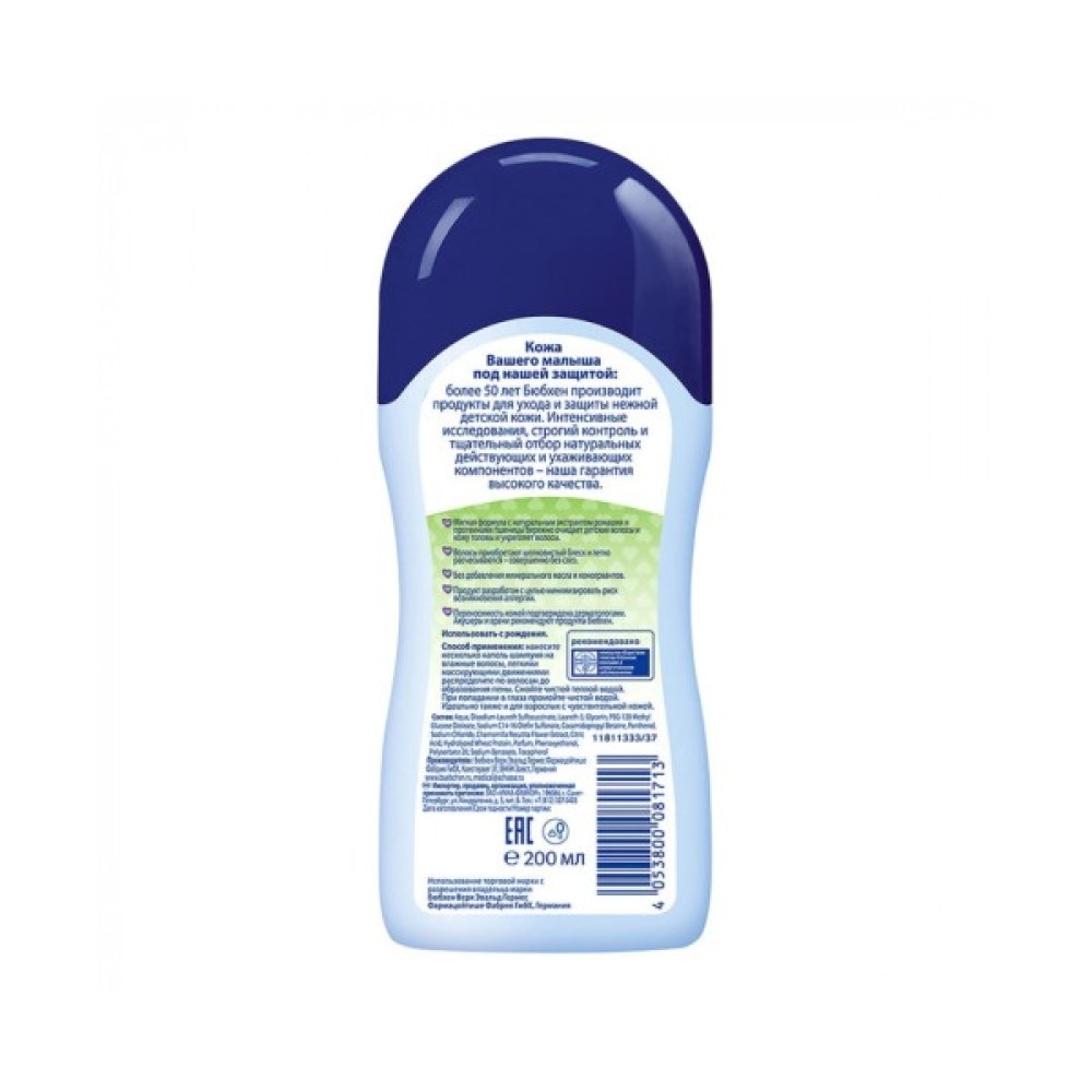 Ніжна структура шампуню і пухнаста м'яка пінка зволожать і захистять шкіру голови Вашої дитини від пересихання. Завдяки спеціальній формулі 'Без сліз' процес миття голови перетвориться в улюблену щоденну процедуру. Містить екстракт ромашки, протеїни пшениці та пантенол. Bübchen в перекладі з німецької - «малюк», девіз компанії Bübchen: «Зворушливий захист». І це не просто гарні слова. Виробники піклуються про здоров'я наших діток, тому використовують для виготовлення засобів по догляду за шкірою тільки натуральні компоненти, екстракти і витяжки з лікарських трав, а також тільки натуральні олії.